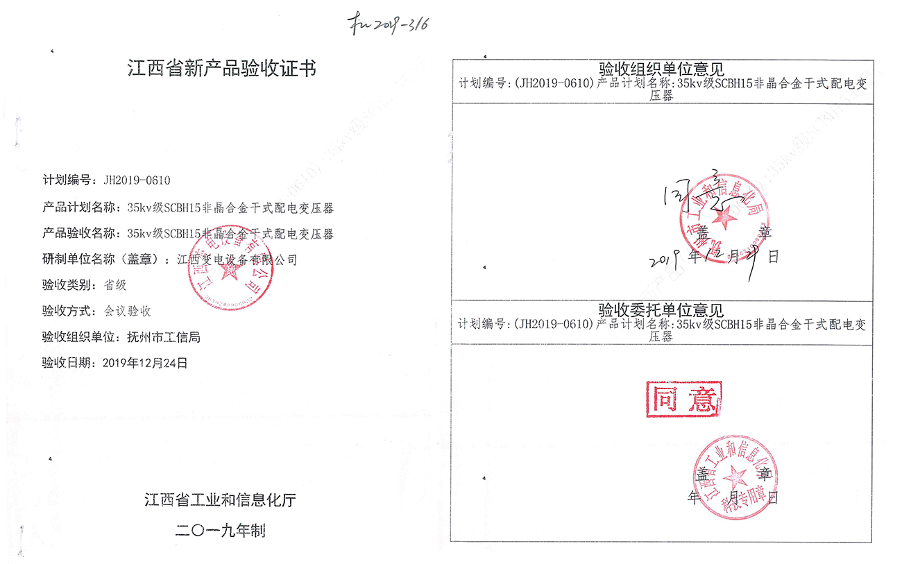 江西省新产品验收证书:35kv级SCBH15非晶合金干式配电变压器(点击下载)