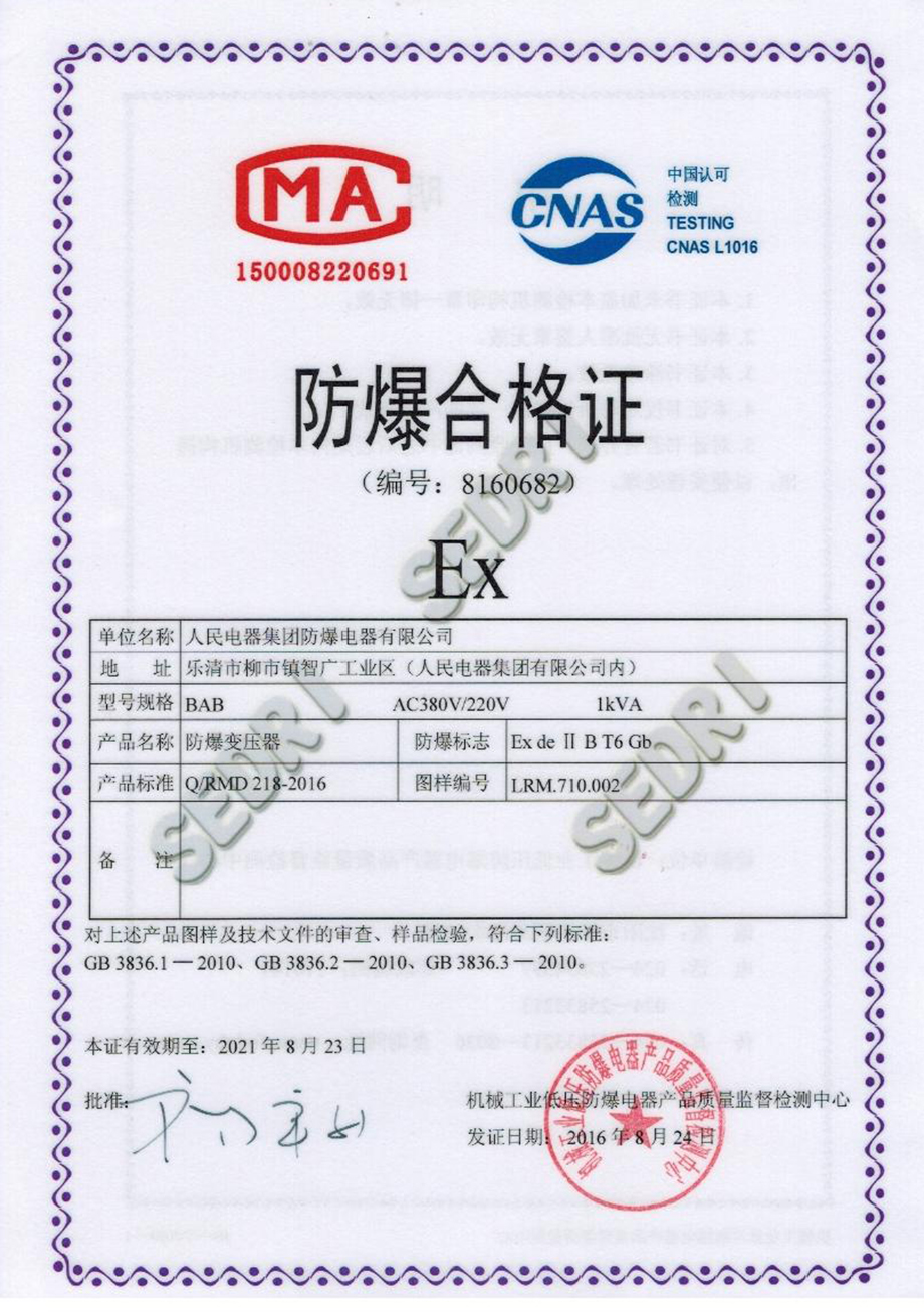 防爆合格证:BAB AC380V/220V 1kVA防爆变压器(点击下载)