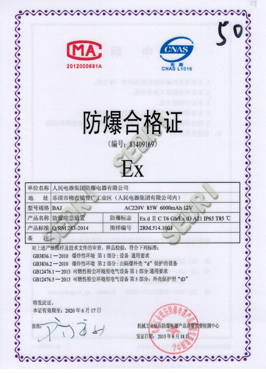 防爆合格证:BAJ AC220V 85W 6000mAh 12V防爆应急装置(点击下载)