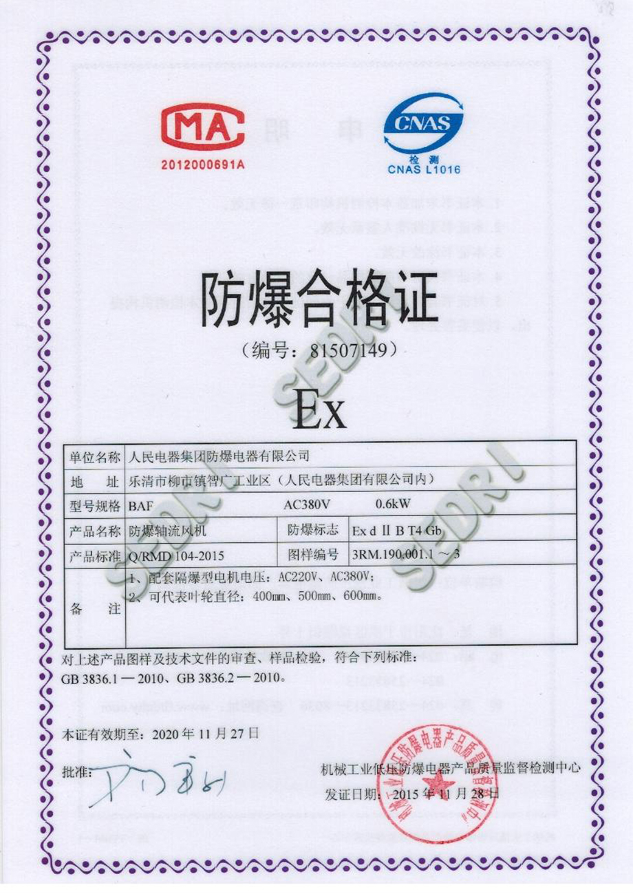 防爆合格证:BAF AC380V 0.6kW防爆轴流风机(点击下载)
