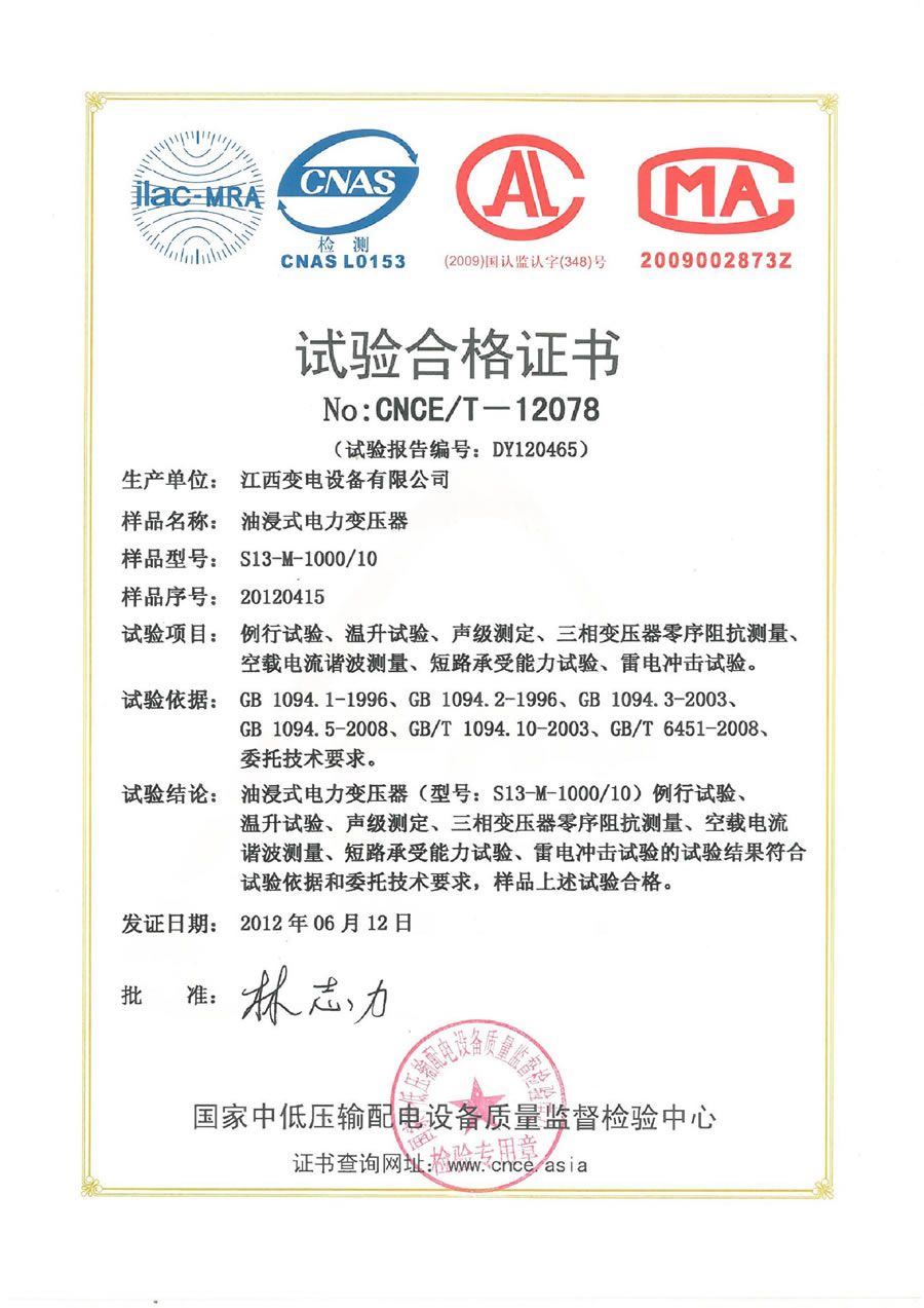 试验合格证书:S13-M-1000/10油浸式电力变压器(点击下载)