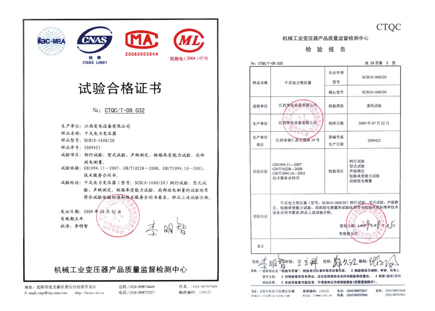 试验合格证书:SCB10-1600/20干式电力变压器(点击下载)