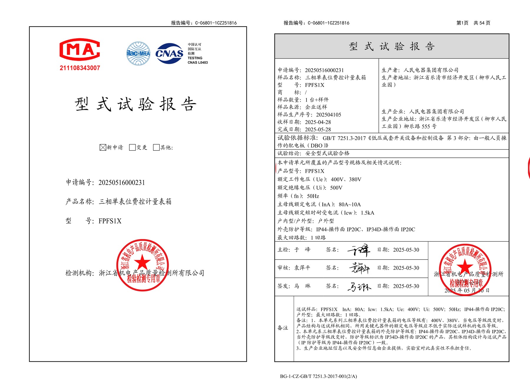 型式试验报告(202505):FPFS1X 80A~10A 三相单表位费控计量表箱(点击下载)