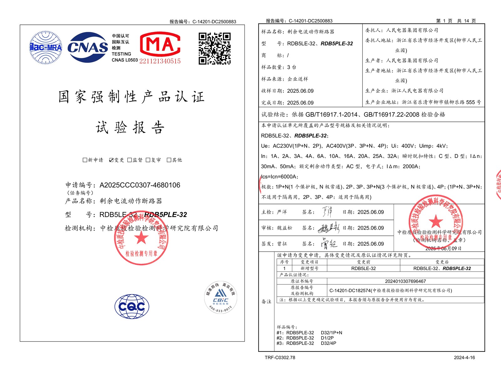 CCC试验报告(202506):RDB5LE-32,RDB5PLE-32剩余电流动作断路器(点击下载)