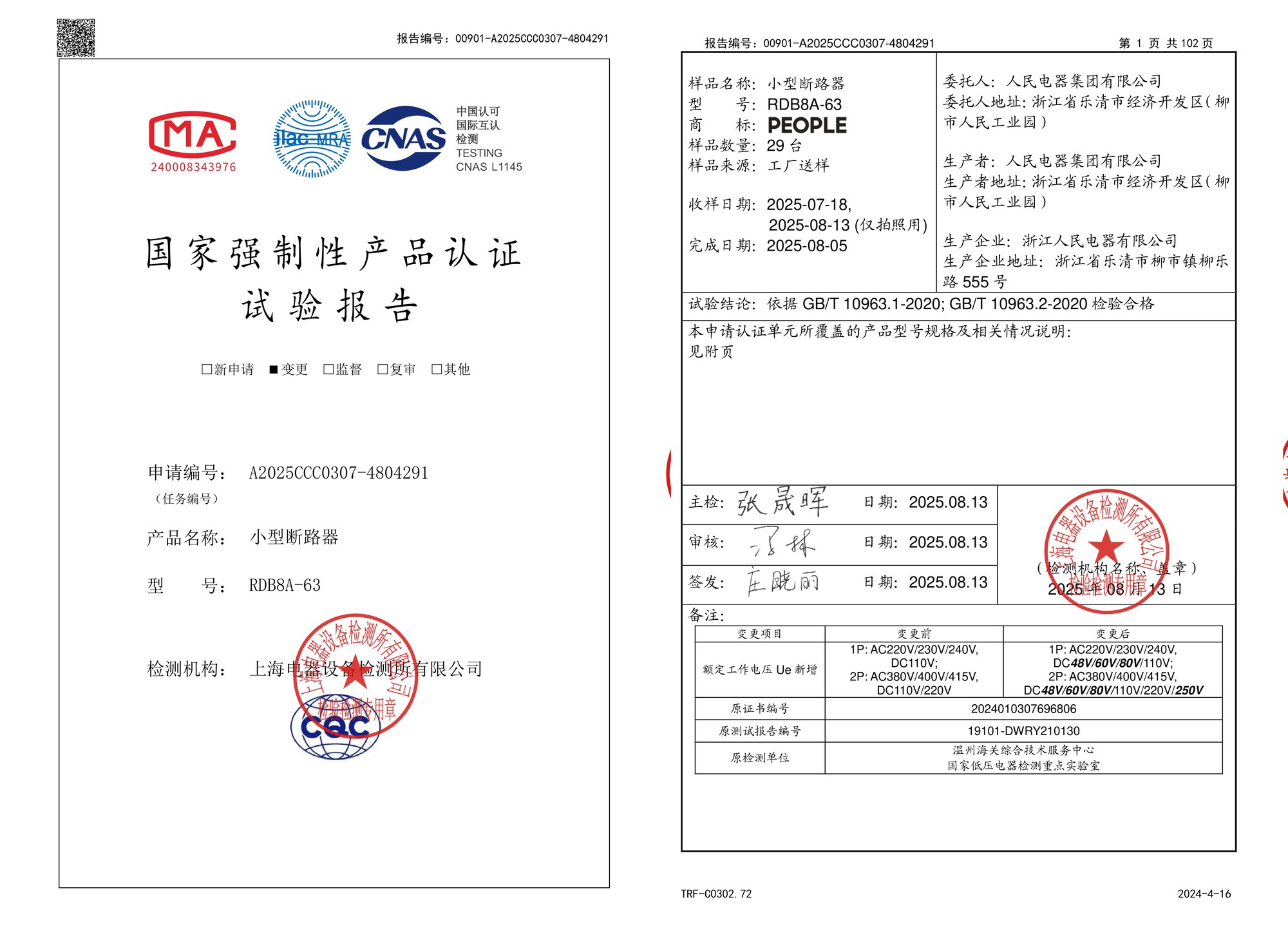 CCC试验报告(202508):RDB8A-63小型断路器(点击下载)