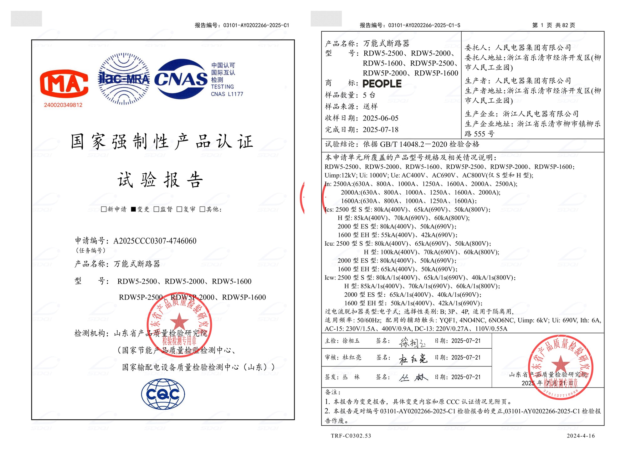 CCC试验报告(202507):RDW5-2500,RDW5-2000,RDW5-1600,RDW5P-2500,RDW5P-2000,RDW5P-1600万能式断路器(点击下载)