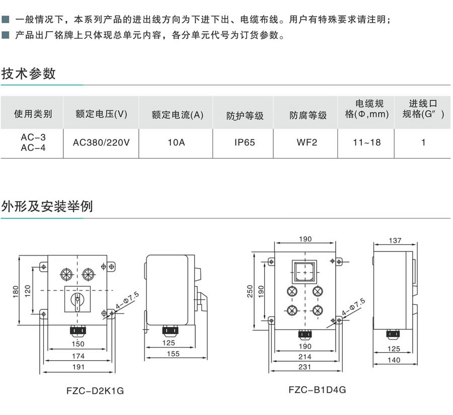 壳体釆用玻璃纤维增强不饱和聚酯树脂模压而成或釆用不锈钢成型;本产品采用曲路密封结构,直接用紧固件紧固,具有良好的防水防尘性能,防护等级IP65所有外露紧固件均用不锈钢,密封件采用硅橡胶,耐油、耐酸、耐碱、耐高温、抗老化本系列产品适用于交流50Hz,电压380V以下,直流至440V以下,电流10A以内的控制电路中,作为工作现场中电动机的起停、控制转换、信号切换、仪表计量显示等之用;内装元件由我公司定型;内装元件主要有:万能转换开关、按钮、电流表、指示灯等,可按用户要求装其他仪表??墒迪指?..