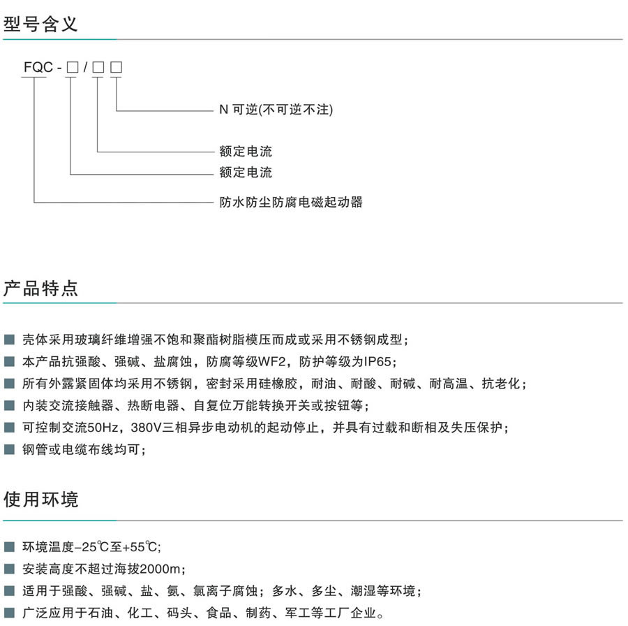 壳体釆用玻璃纤维增强不饱和聚酯树脂模压而成或采用不锈钢成型;本产品抗强酸、强碱、盐腐蚀,防腐等级WF2,防护等级为IP65;所有外露紧固体均采用不锈钢,密封釆用硅橡胶,耐油、耐酸、耐碱、耐高温、抗老化内装交流接触器、热断电器、自复位万能转换开关或按钮等;可控制交流50Hz,380V三相异步电动机的起动停止,并具有过载和断相及失压保护;钢管或电缆布线均可;