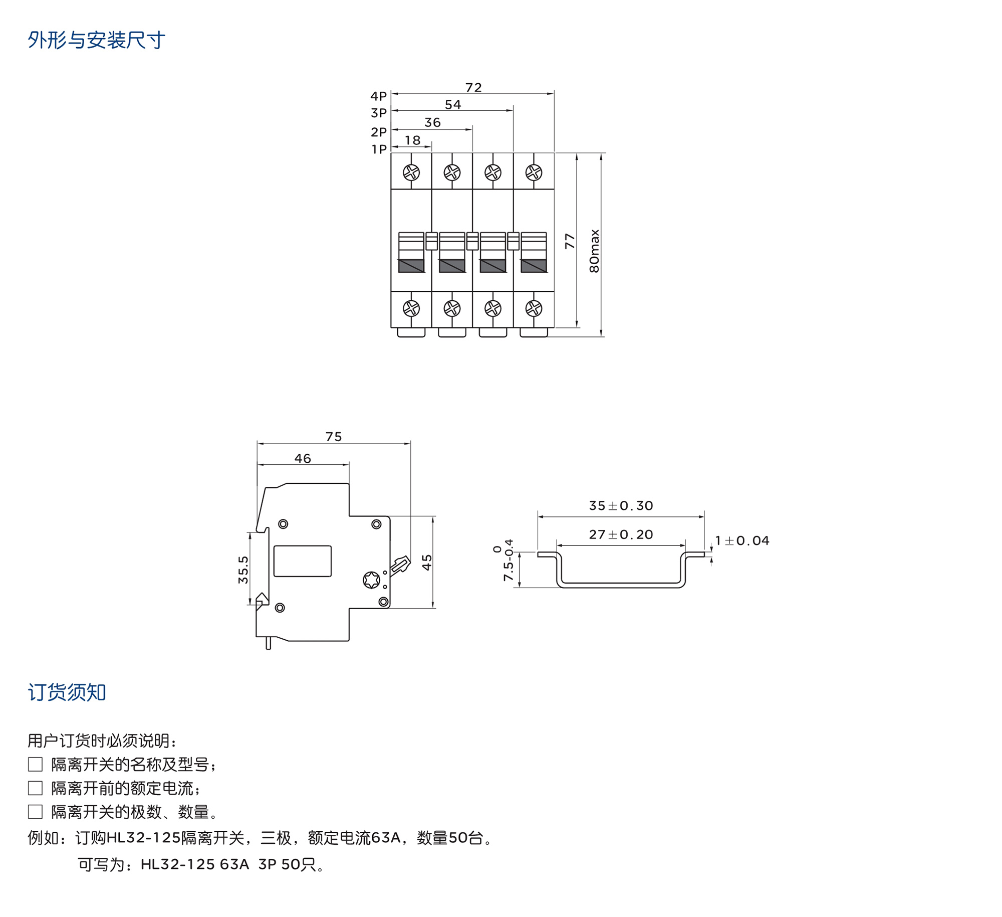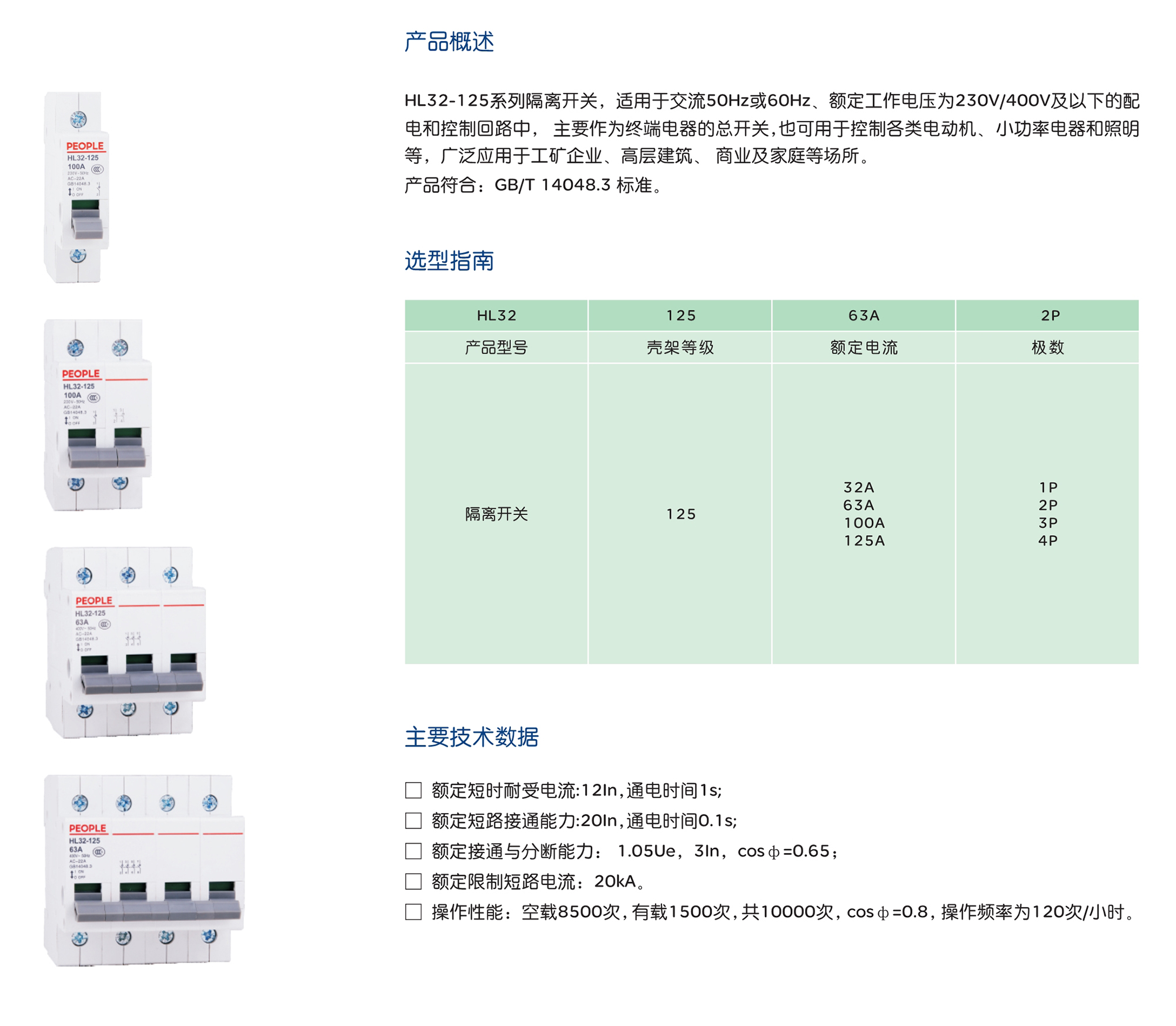 HL32-125系列隔离开关,适用于交流50Hz或60Hz、额定工作电压为230V/400V及以下的配 电和控制回路中, 主要作为终端电器的总开关,也可用于控制各类电动机、小功率电器和照明 等,广泛应用于工矿企业、高层建筑、 商业及家庭等场所。 产品符合:GB/T 14048.3 标准。