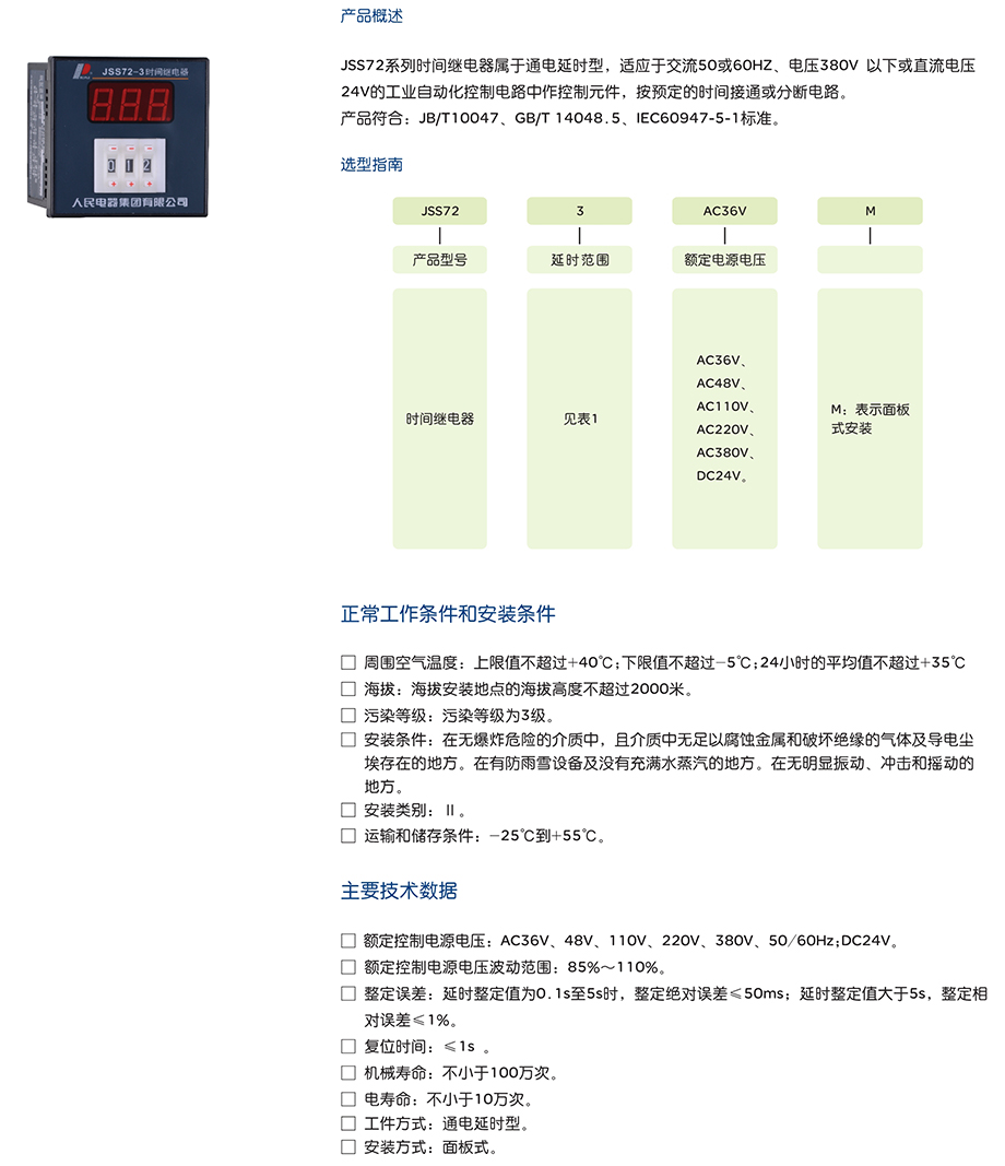JSS72系列时间继电器属于通电延时型,适应于交流50或60H2、电压380V以下或直流电压24V的工业自动化控制电路中作控制元件,按预定的时间接通或分断电路产品符合:JB/T10047、GB/T14048.5、IEC60947-5-1标准。