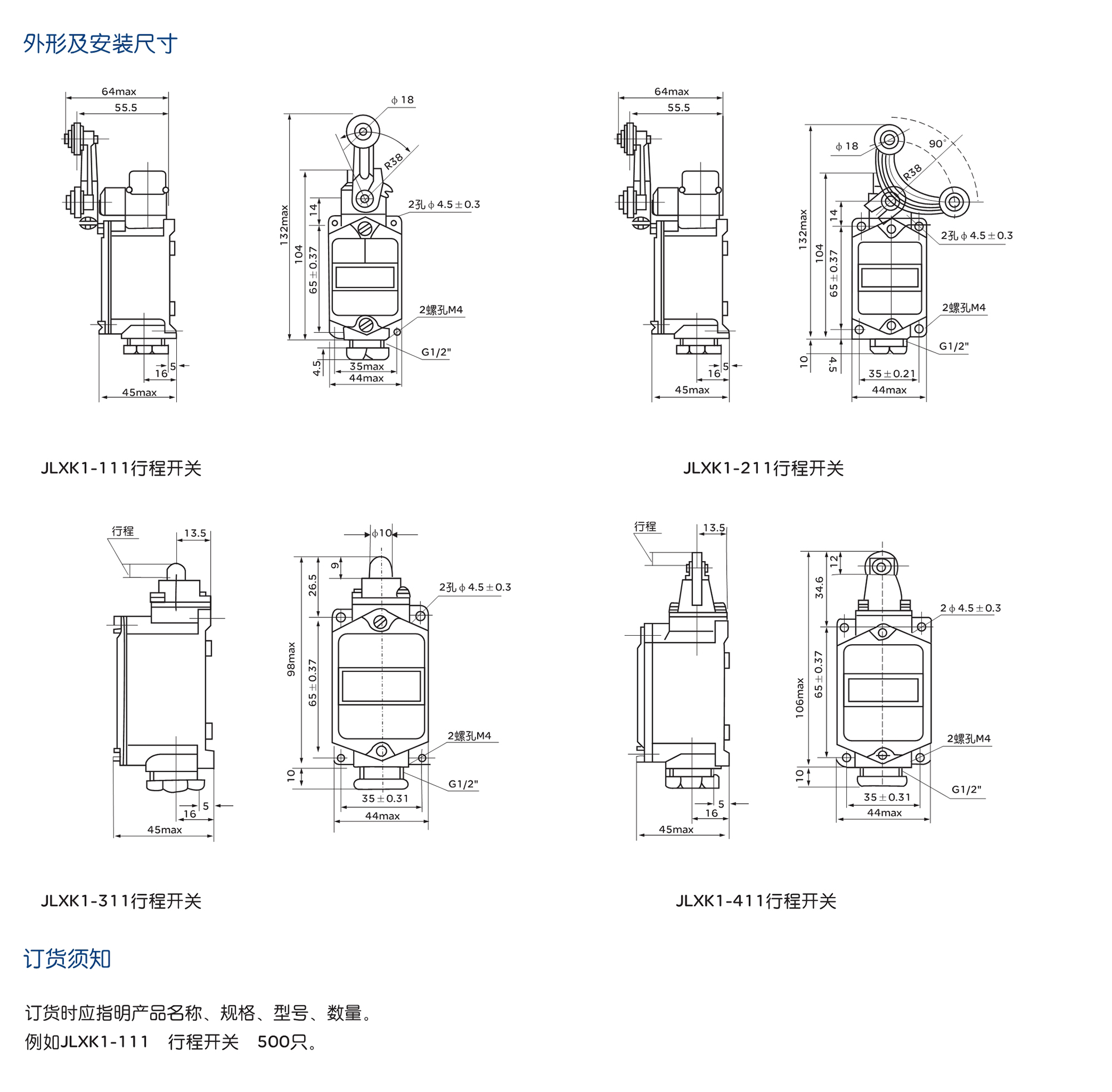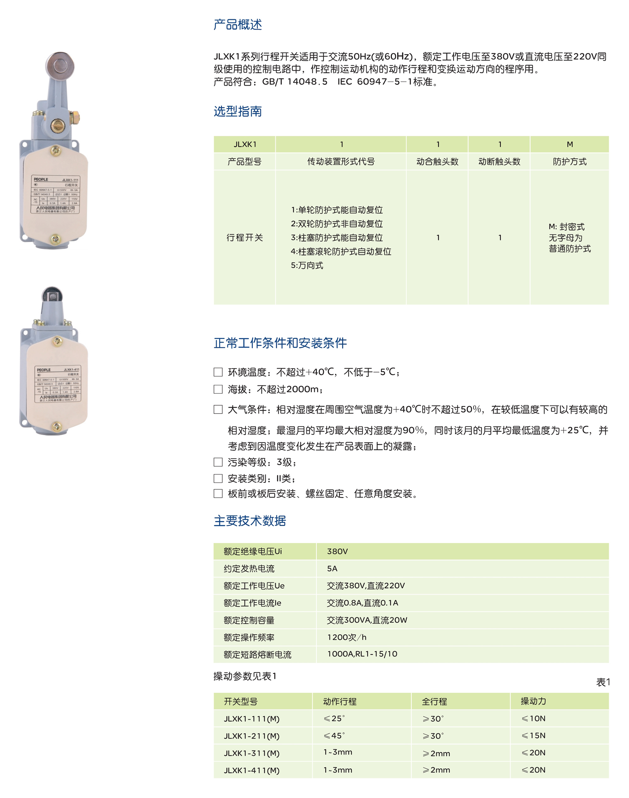 JLXK1系列行程开关适用于交流50Hz(或60Hz),额定工作电压至380V或直流电压至220V同 级使用的控制电路中,作控制运动机构的动作行程和变换运动方向的程序用。 产品符合: GB/T 14048.5 IEC 60947-5-1标准。