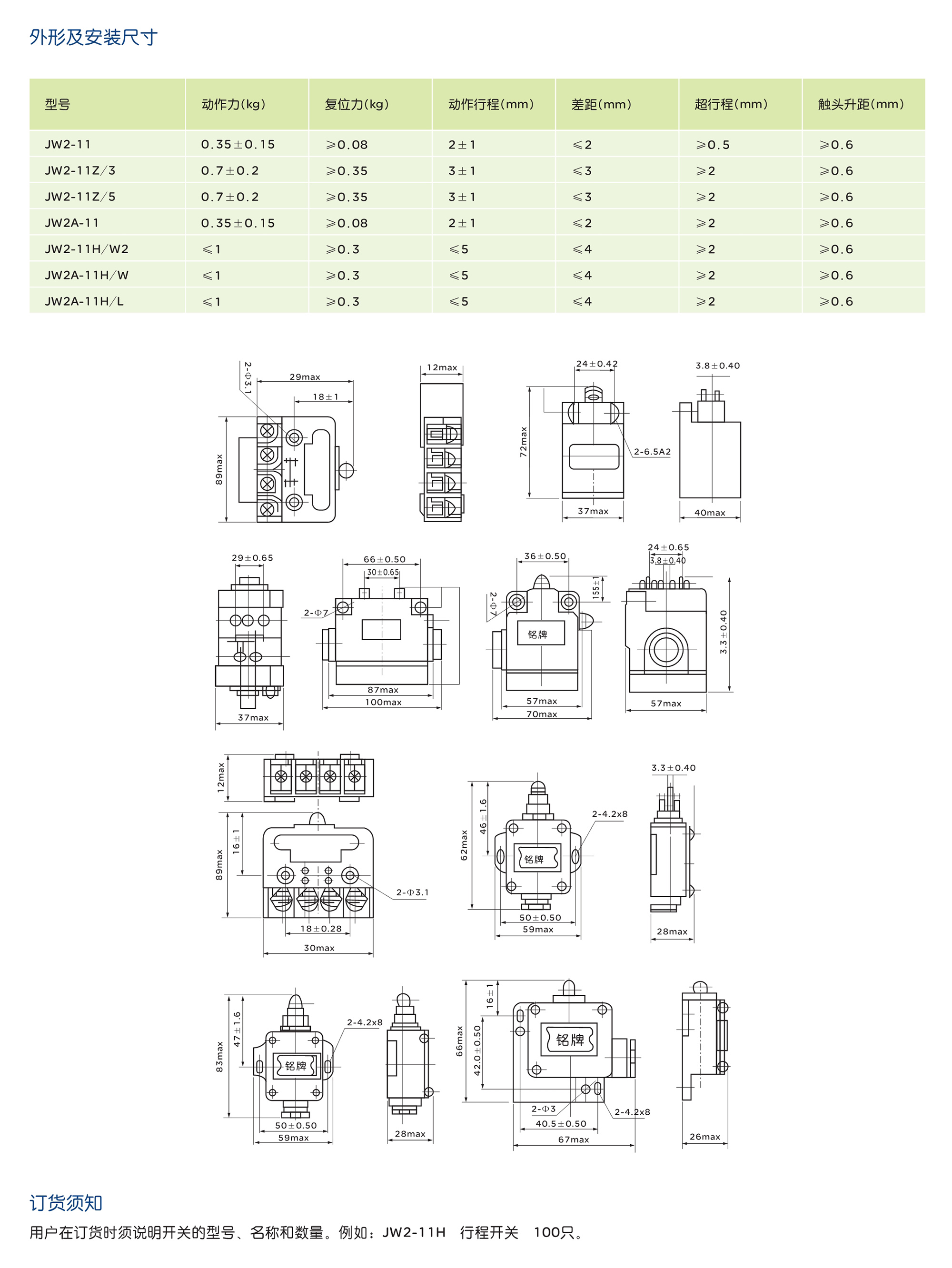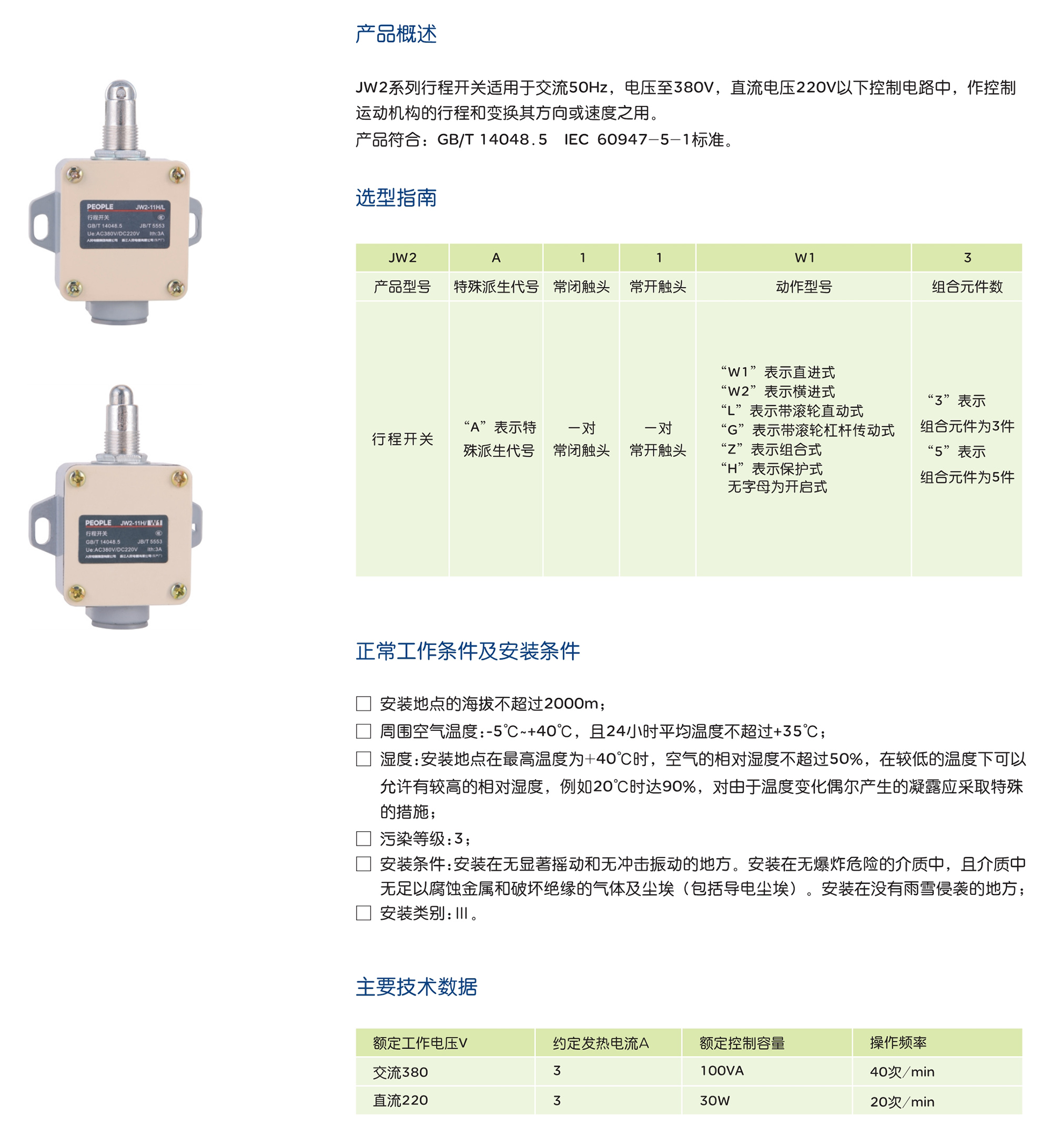 JW2系列行程开关适用于交流50Hz,电压至380V,直流电压220V以下控制电路中,作控制 运动机构的行程和变换其方向或速度之用。 产品符合:GB/T 14048.5 IEC 60947-5-1标准。