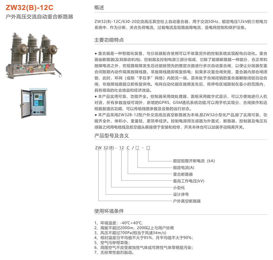 ZW32(B)-12C/630-20交流高压真空柱上自动重合器,用于交流50Hz,额定电压12kV的三相电力 系统中,作为分断、关合负荷电流、过载电流及短路故障电流,是电网控制和?;っ槐?。