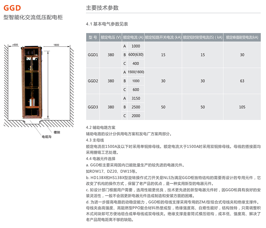 GGD型交流低压配电柜适用于发电厂、变电所、工业企业等电力用户作为交流50Hz,额定工作电压380V,额定电流至3150A的配电系统中作为动力,照明及配电设备的电能转换、分配与控制之用。该产品分断能力高,额定短时耐受电流达50kA线路方案灵活、组合方便、实用性强、结构新颖等特点。该产品是我国组装式、固定面板开关柜的代表产品之一。 该产品符合IEC439《低压成套开关设备和控制设备》,GB7251《低压成套开关设备中》等标准。