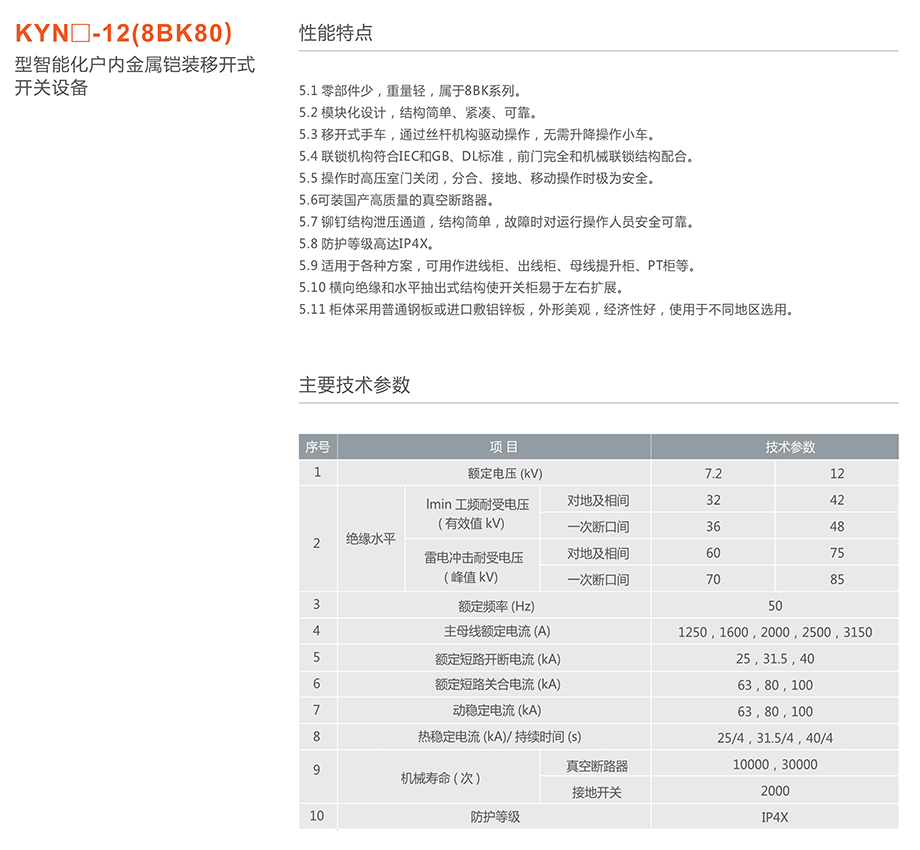 KYN□-12(8BK80)户内金属铠装移开式开关设备以下简称开关柜)是我公司生产的一种新型户内电气成套装置,其设计技术不仅充分考虑了中国的现有标准要求,而且符合我国国情;柜体有普通钢板和进口敷铝锌板两种,防护等级达到IP4X,适用于3.6-12k∨三相交流50Hz的单母线分段系统,对电路进行控制、保护、监视和测量之用。该产品符合GB3906、GB311、GB11022、DL/T404、IEC298等标准规定KYN□-12(8BK80)系不靠墙安装