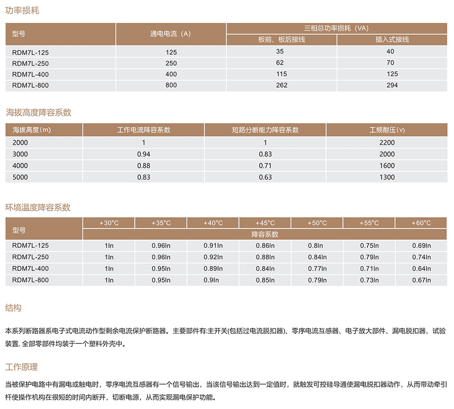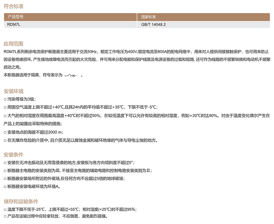 RDM7L系列剩余电流?;ざ下菲髦饕视糜诮涣?0Hz,额定工作电压为400V,额定电流至800A的配电网络中,用来对人提供间接接触?;?,也可用来防止因设备绝缘损坏, 产生接地故障电流而引起的火灾危险,并可用来分配电能和?;は呗芳暗缭瓷璞傅墓睾投搪? 还可作为线路的不频繁转换和电动机不频繁启动之用。