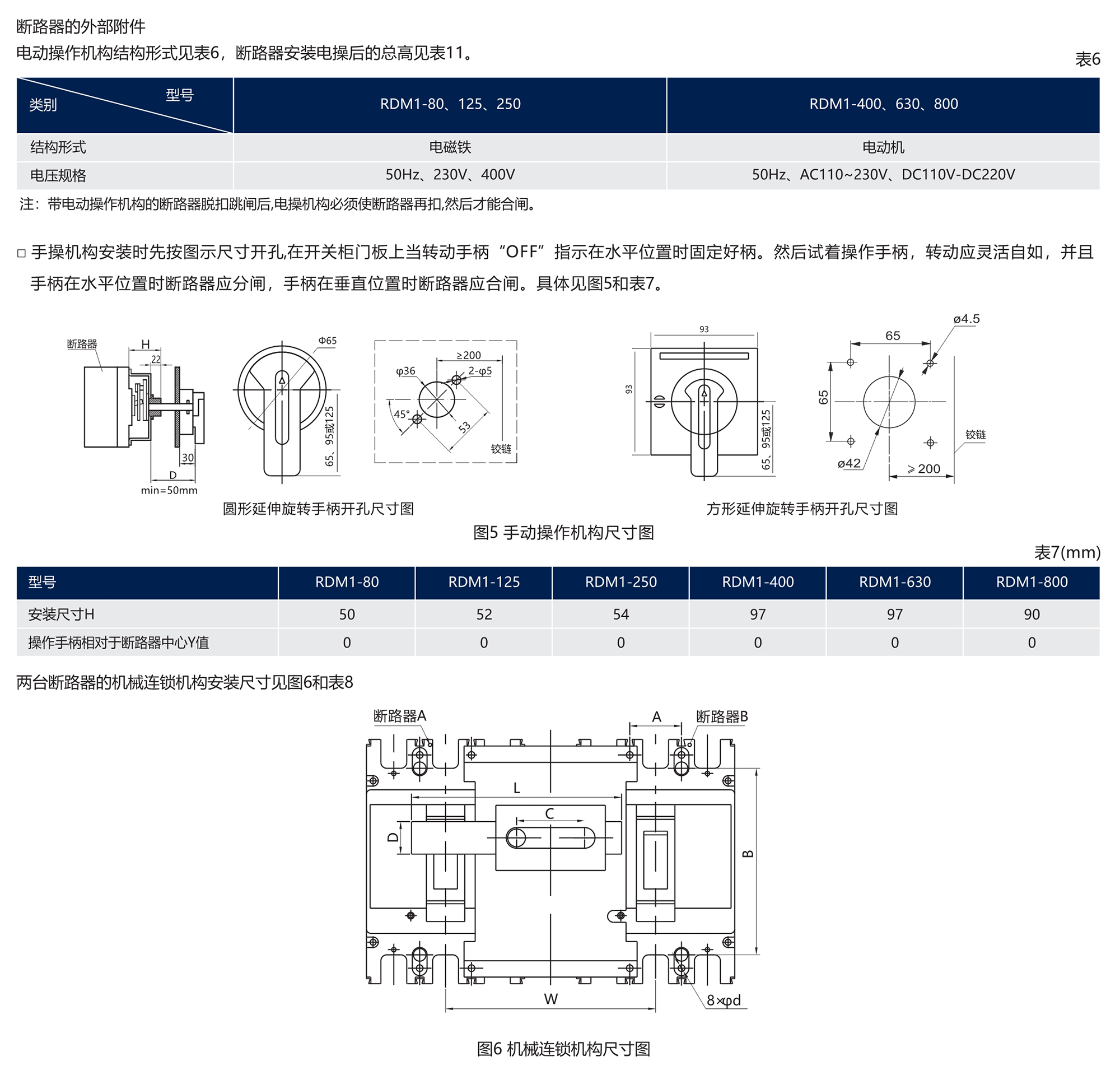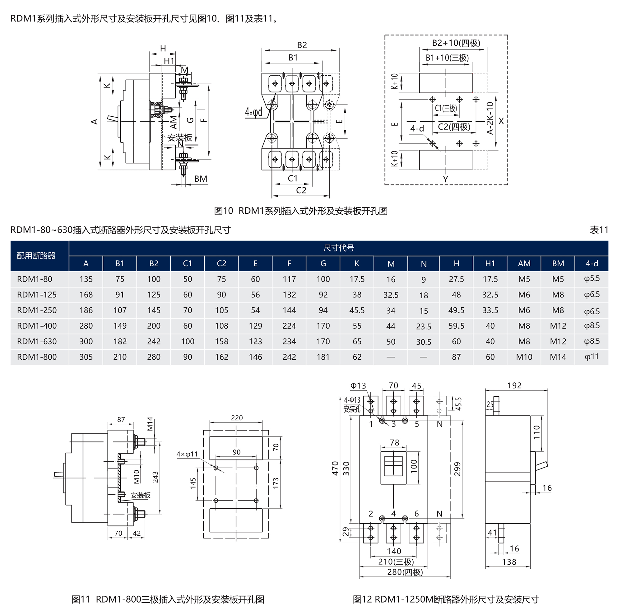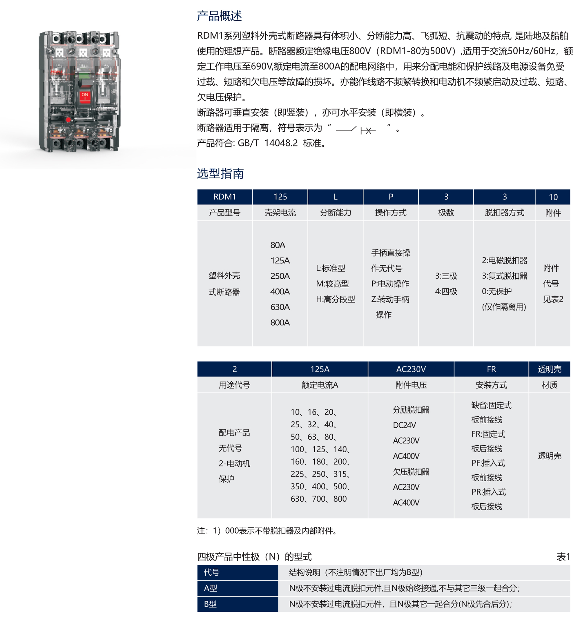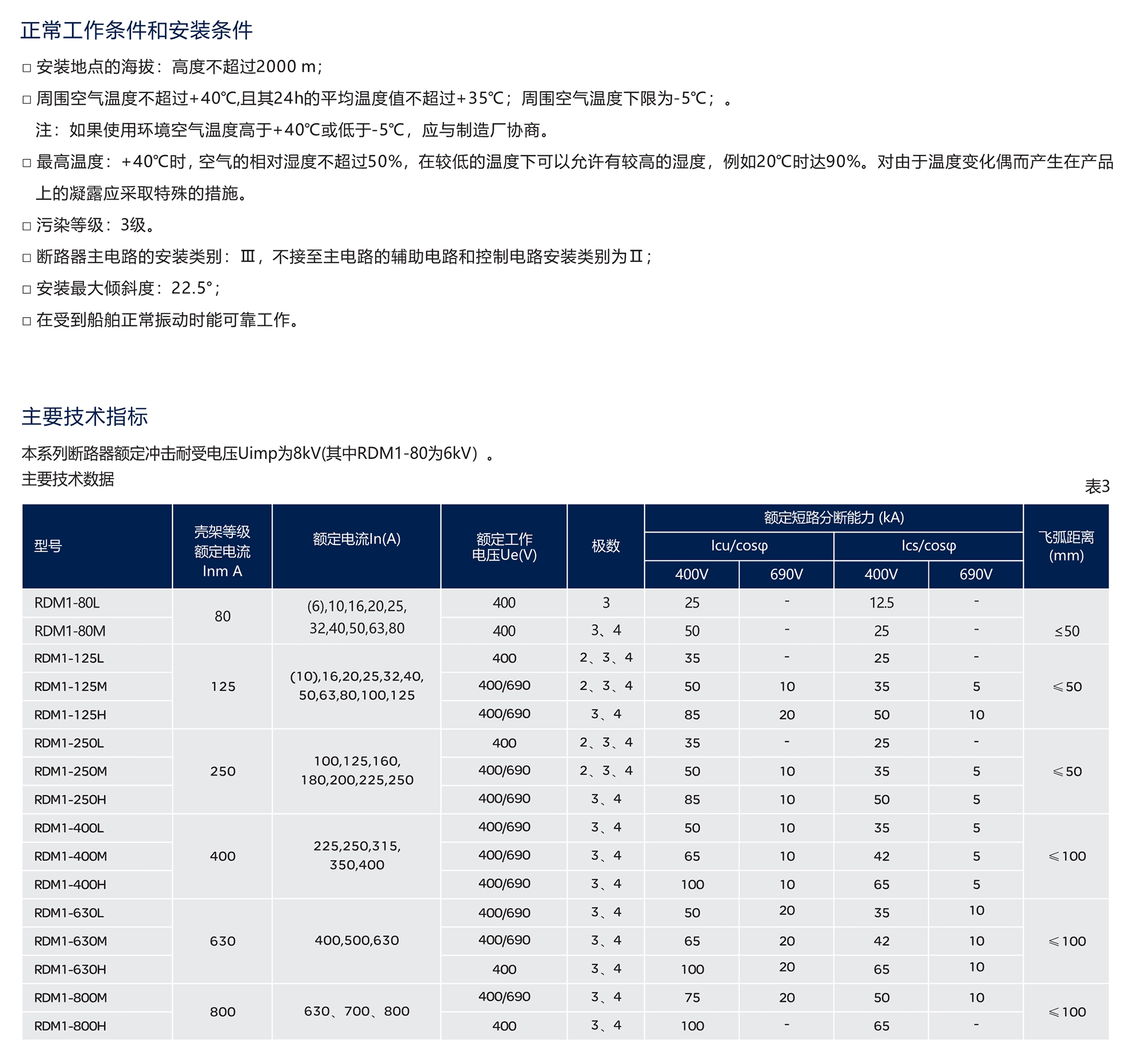 RDM1系列塑料外壳式断路器具有体积小、分断能力高、飞弧短、抗震动的特点, 是陆地及船舶使用的理想产品。断路器额定绝缘电压800V(RDM1-80为500V),适用于交流50Hz/60Hz,额定工作电压至690V,额定电流至800A的配电网络中,用来分配电能和?;は呗芳暗缭瓷璞该馐芄亍⒍搪泛颓返缪沟裙收系乃鸹?。亦能作线路不频繁转换和电动机不频繁启动及过载、短路、欠电压保护。