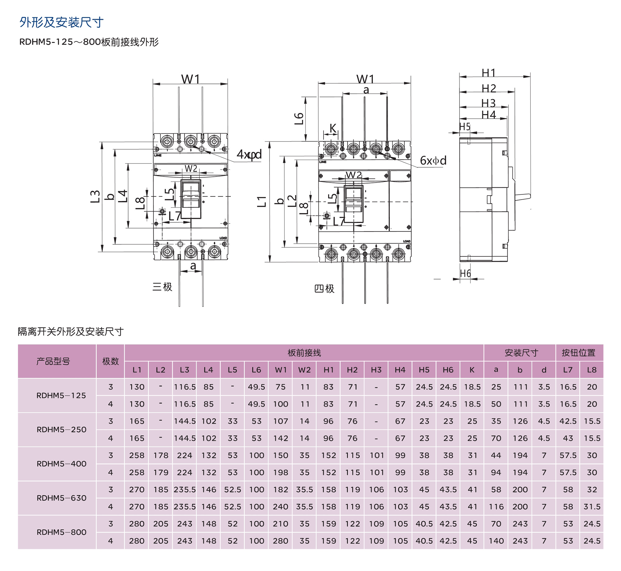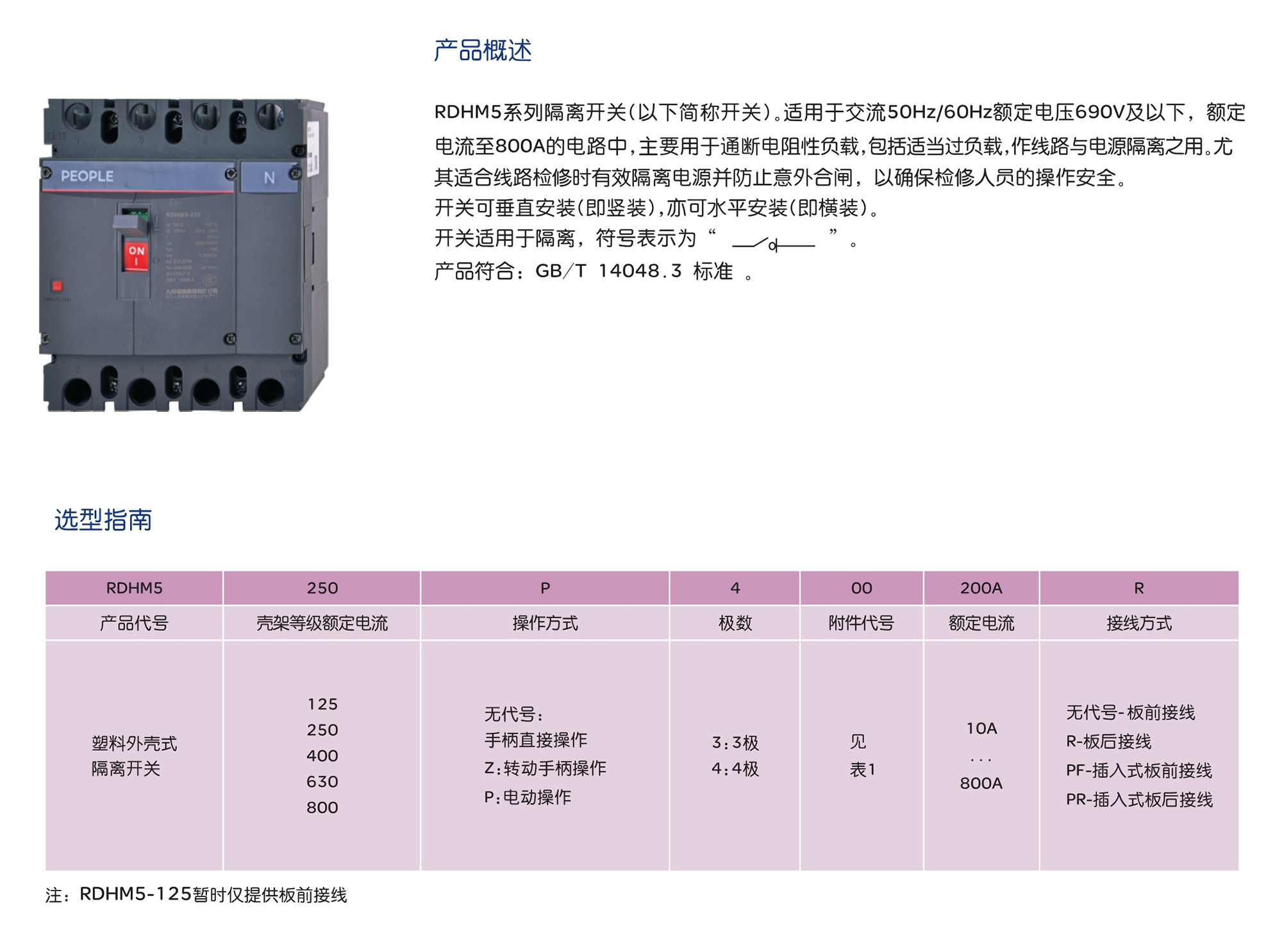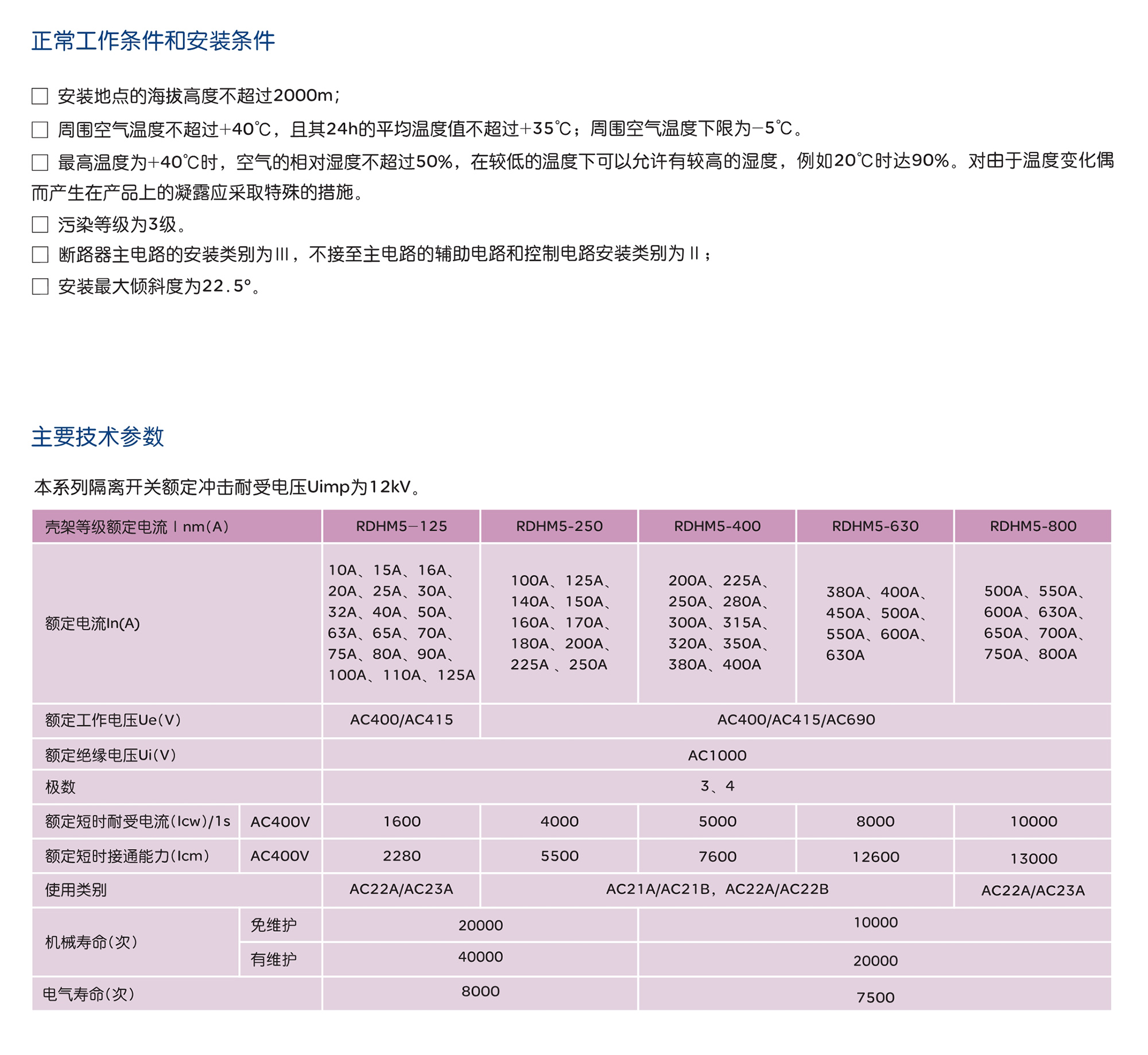 RDHM5系列隔离开关(以下简称开关)。适用于交流50Hz/60Hz额定电压690V及以下,额定电流至800A的电路中,主要用于通断电阻性负载,包括适当过负载,作线路与电源隔离之用。尤其适合线路检修时有效隔离电源并防止意外合闸,以确保检修人员的操作安全。 开关可垂直安装(即竖装),亦可水平安装(即横装)。 开关适用于隔离,产品符合:GB/T 14048.3 标准 。