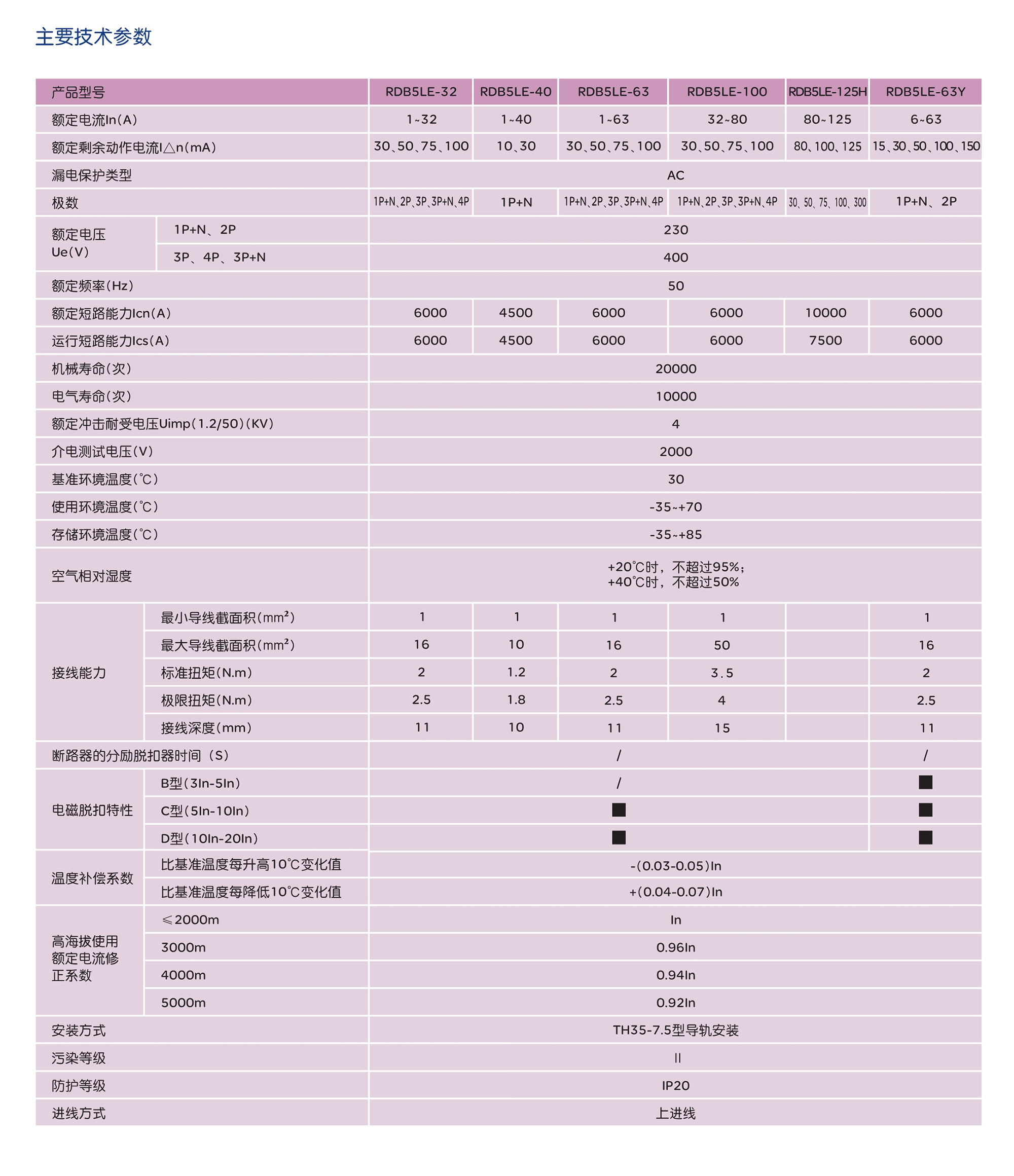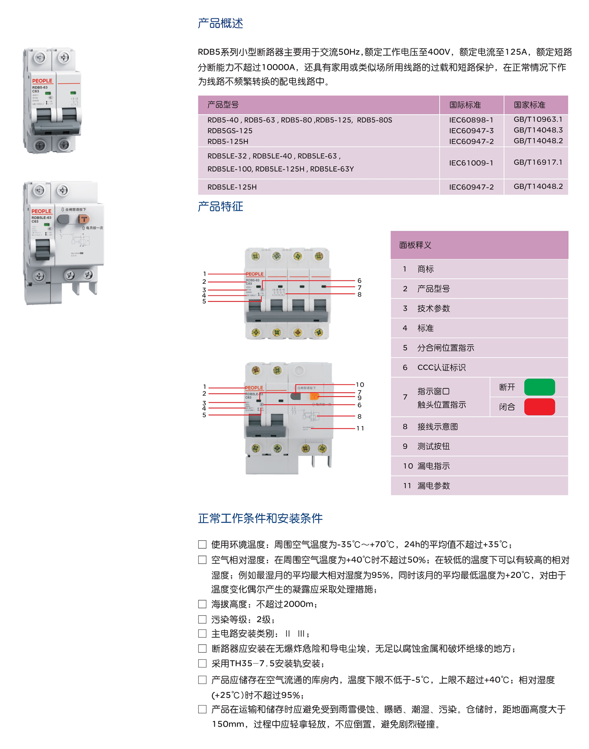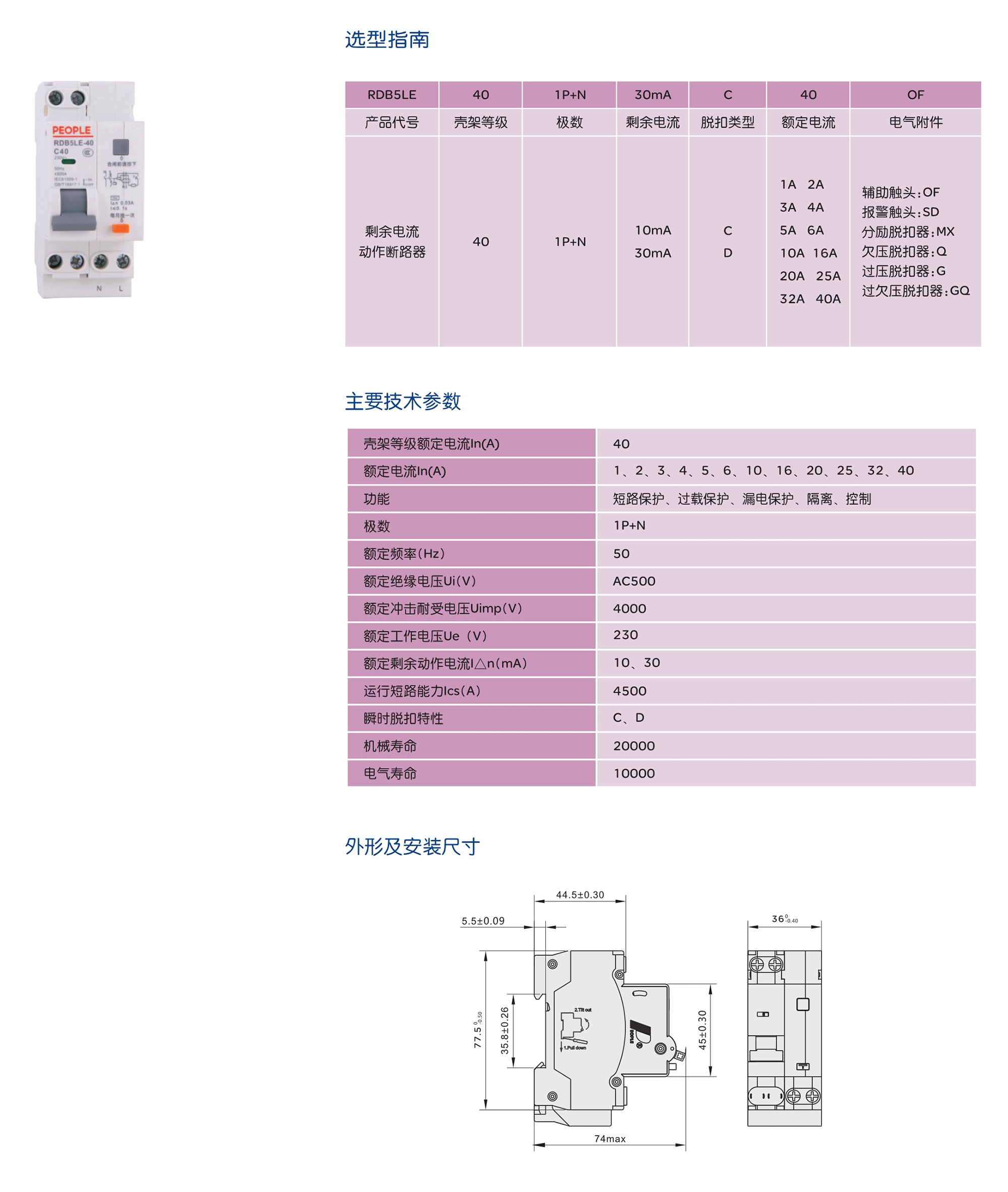 RDB5LE-40漏电断路器(以下简称漏电断路器),主要用于交流50Hz(或60HZ),额定工作电压230V,额定电流至40A,额定短路分断能力不超过4500A的?;づ涞缦呗分?,作为线路不频繁接通、分断和转换之用,具有过载、短路和漏电(触电)保护功能。 产品符合:GB/T16917.1 标准。
