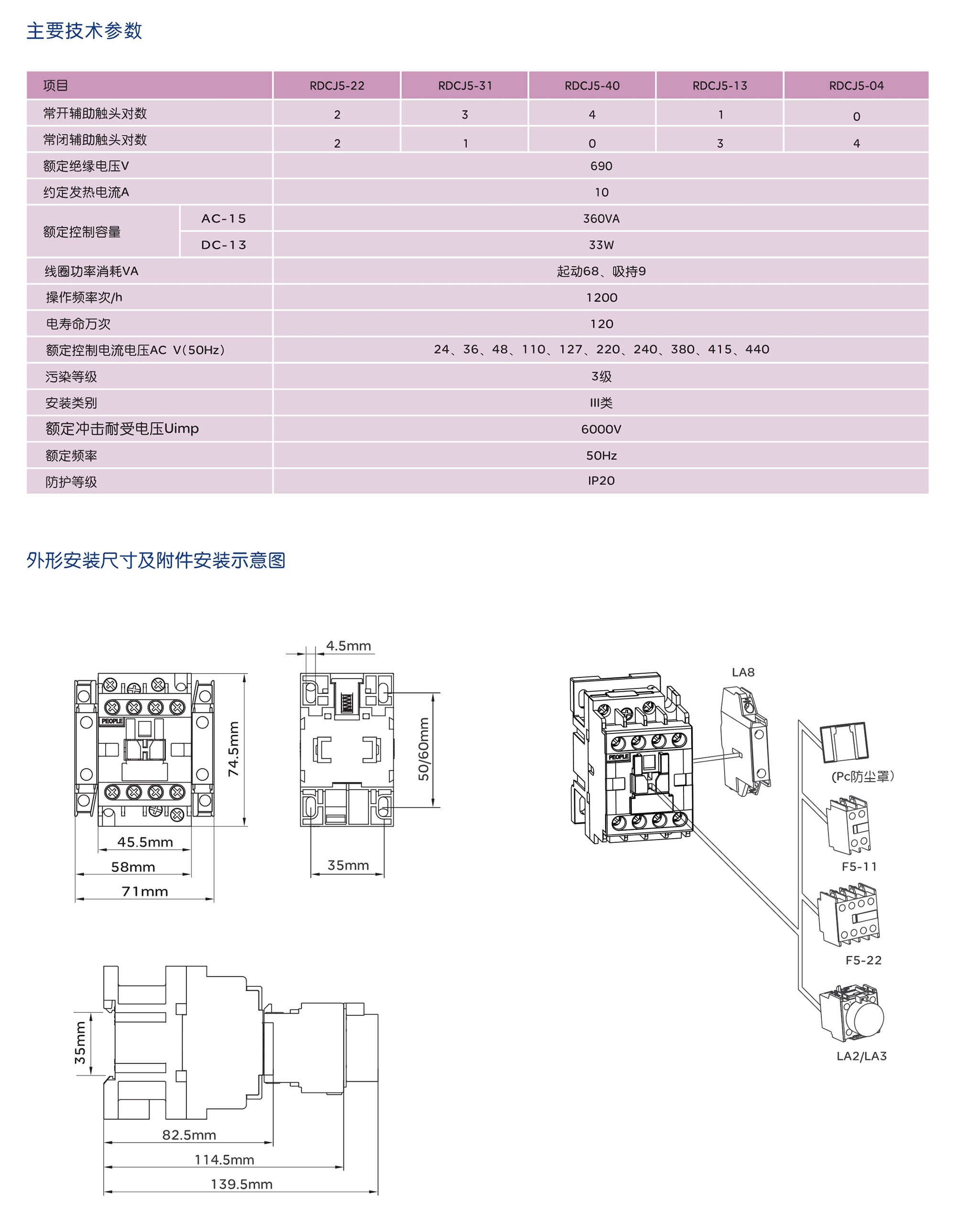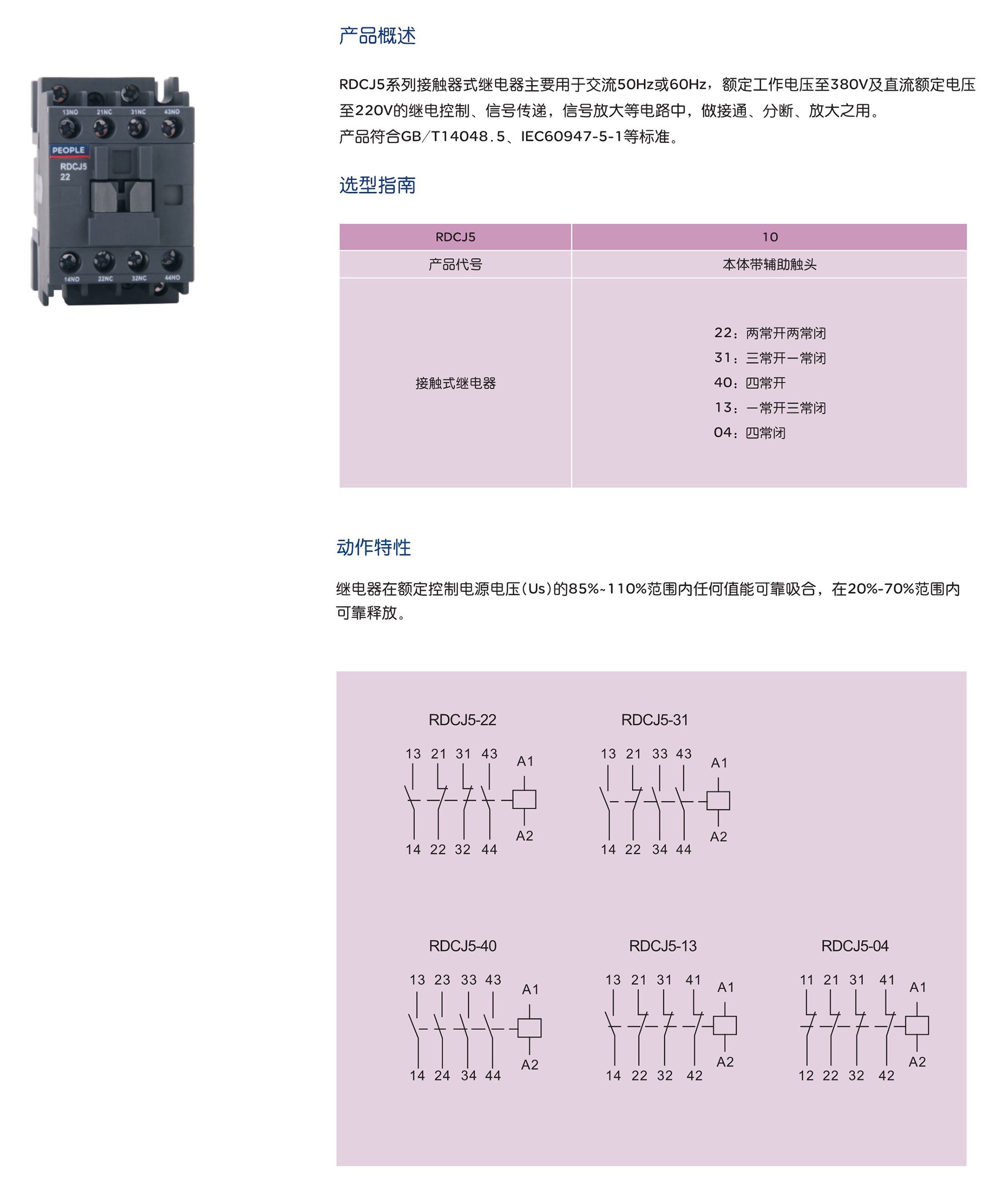 RDCJ5系列接触器式继电器主要用于交流50Hz或60Hz,额定工作电压至380V及直流额定电压 至220V的继电控制、信号传递,信号放大等电路中,做接通、分断、放大之用。 产品符合GB/T14048.5、IEC60947-5-1等标准。