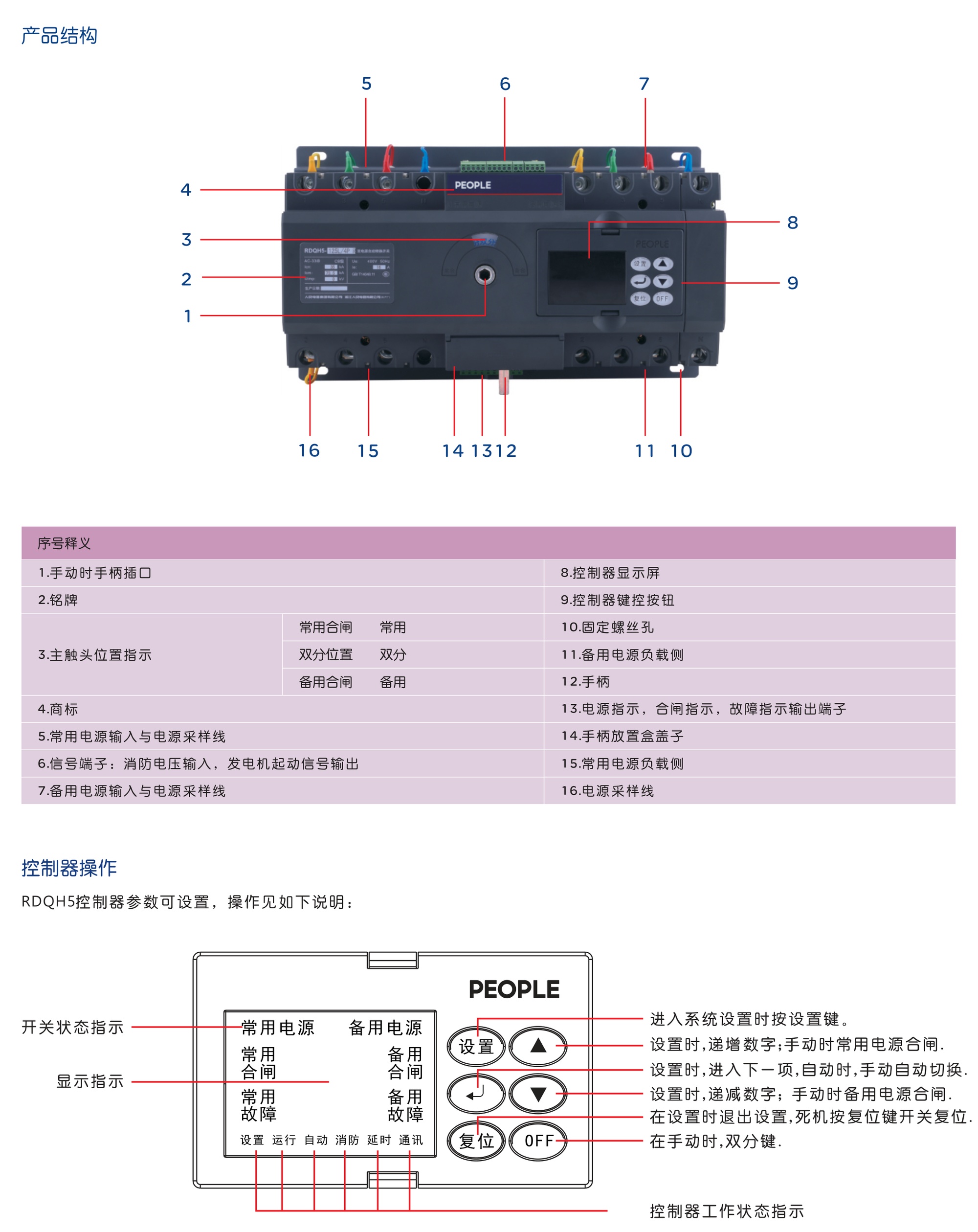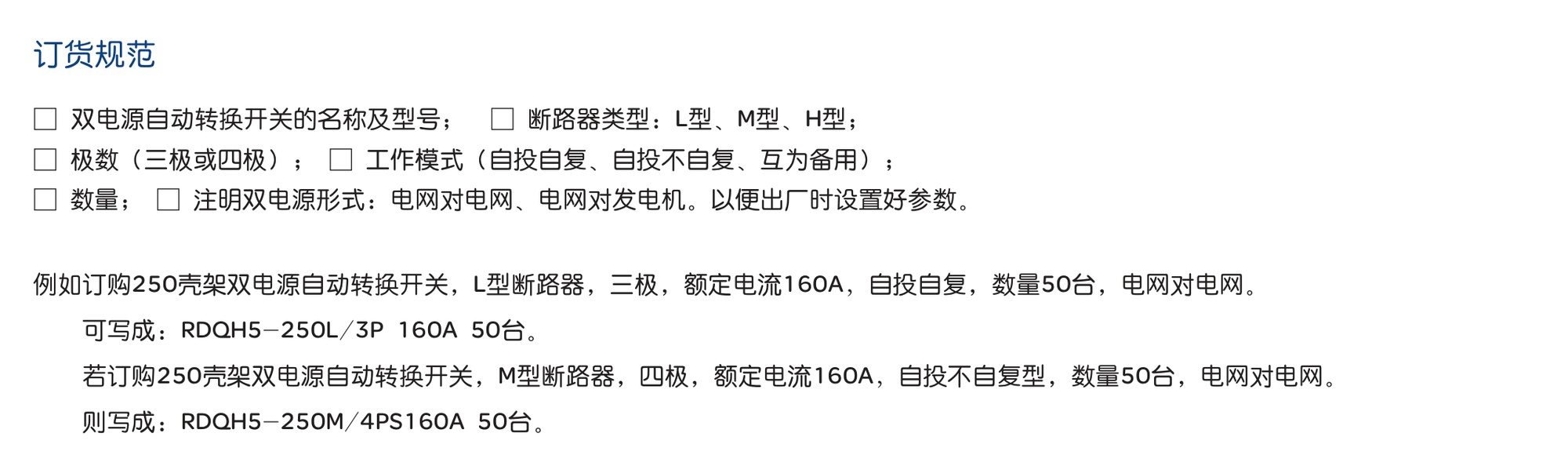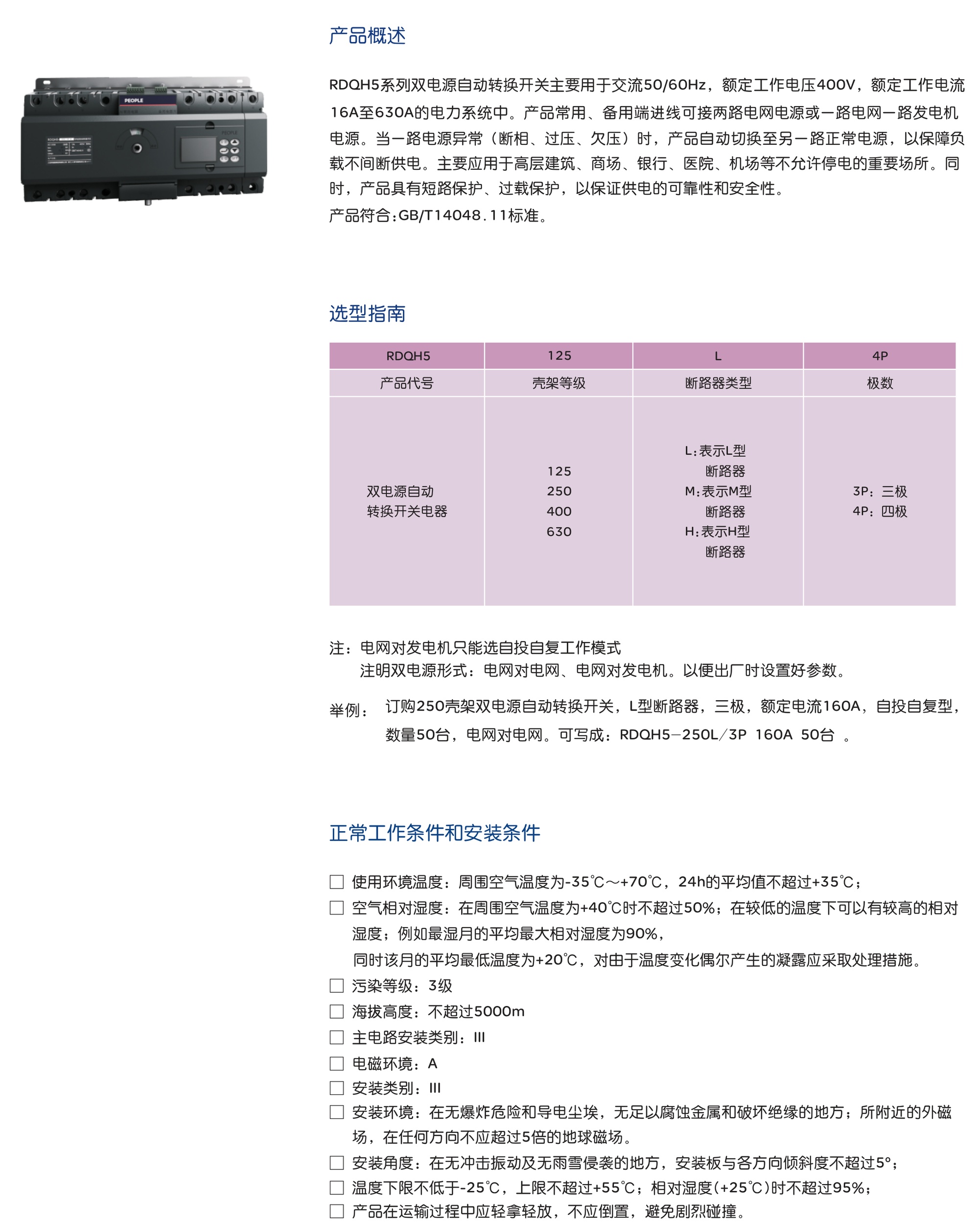 RDQH5系列双电源自动转换开关主要用于交流50/60Hz,额定工作电压400V,额定工作电流16A至630A的电力系统中。产品常用、备用端进线可接两路电网电源或一路电网一路发电机电源。当一路电源异常(断相、过压、欠压)时,产品自动切换至另一路正常电源,以保障负载不间断供电。主要应用于高层建筑、商场、银行、医院、机场等不允许停电的重要场所。同时,产品具有短路?;?、过载保护,以保证供电的可靠性和安全性。