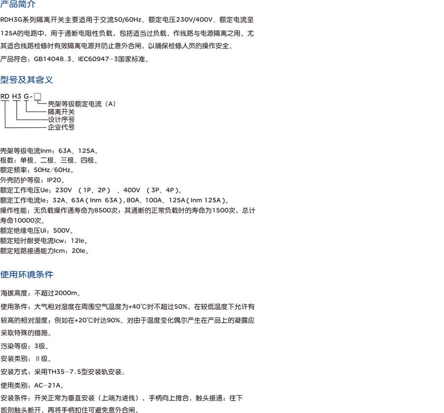 RDH3G系列隔离开关主要适用于交流50/60Hz、额定电压230V/400V、额定电流至125A的电路中,用于通断电阻性负载,包括适当过负载,作线路与电源隔离之用。尤其适合线路检修时有效隔离电源并防止意外合闸,以确保检修人员的操作安全。 产品符合:GB14048.3、IEC60947-3国家标准。