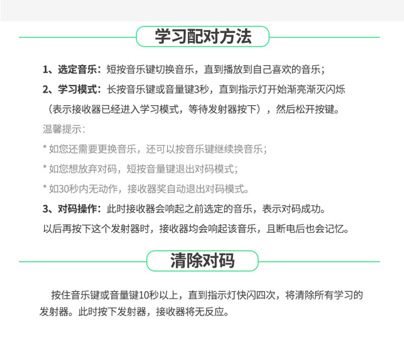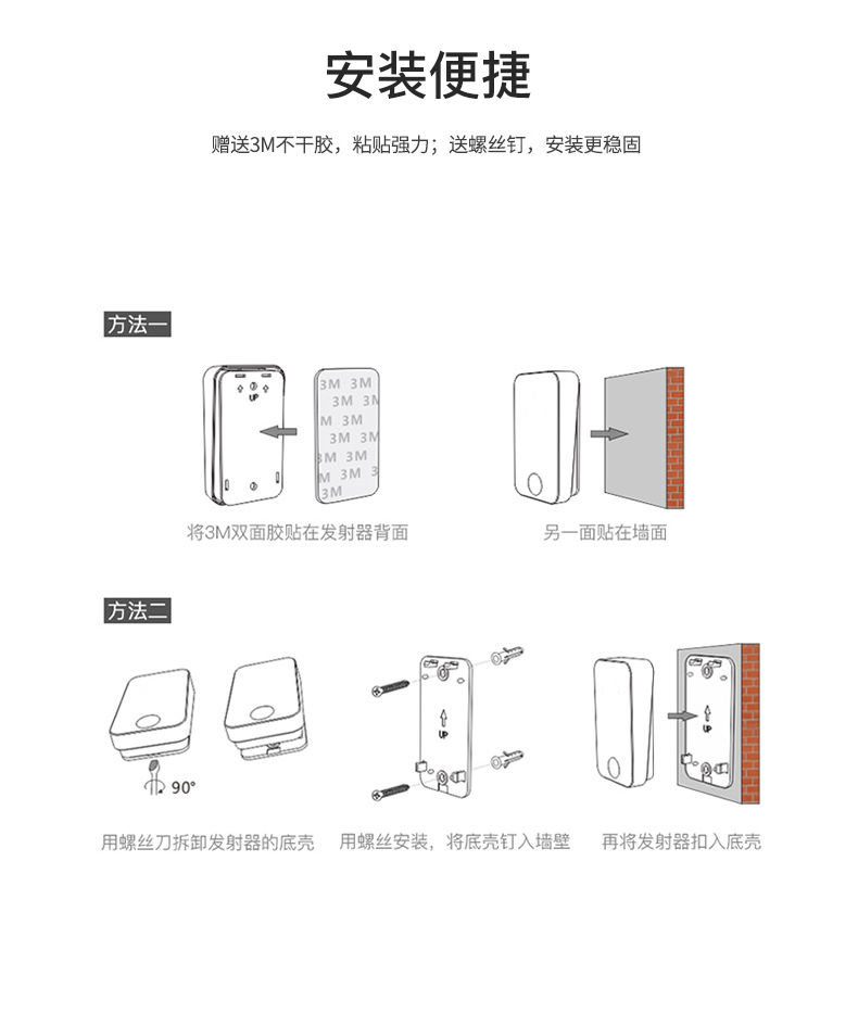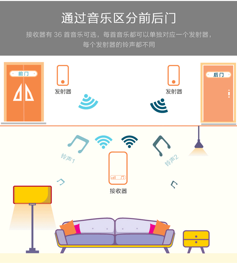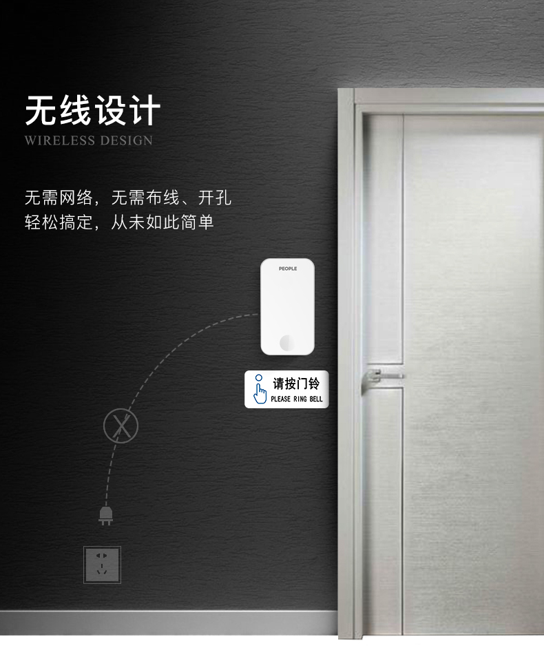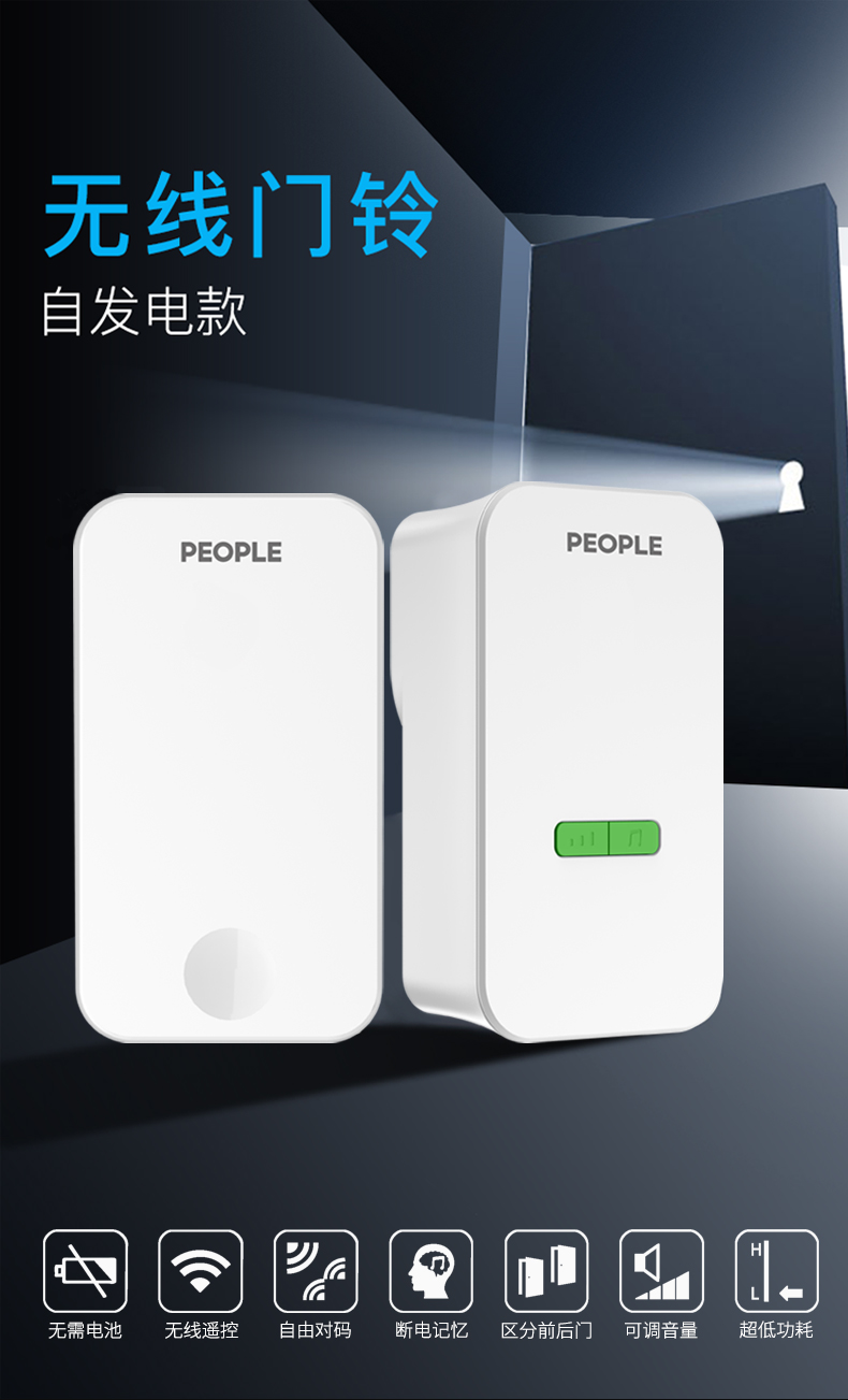 无需电池、无线???、自由对码、断电记忆、区分前后门、可调音量、超低功耗