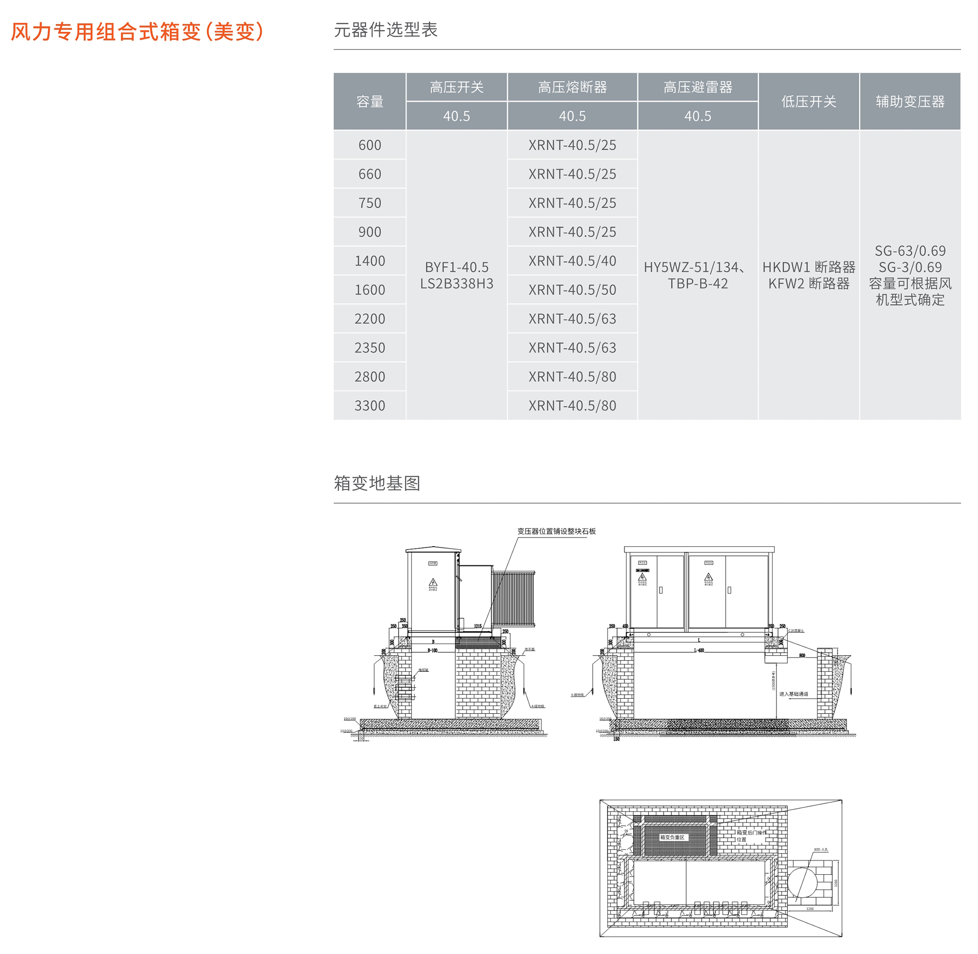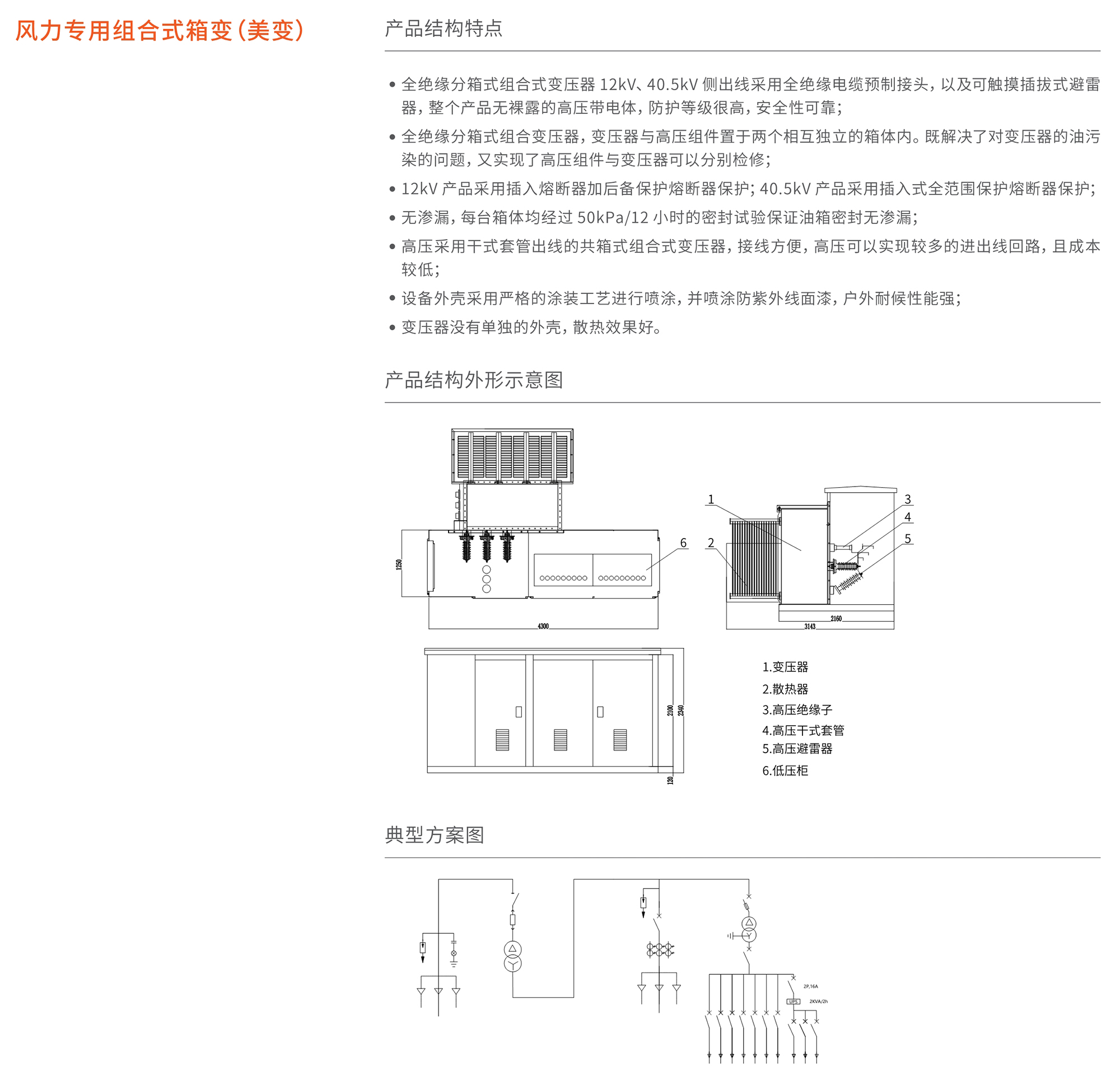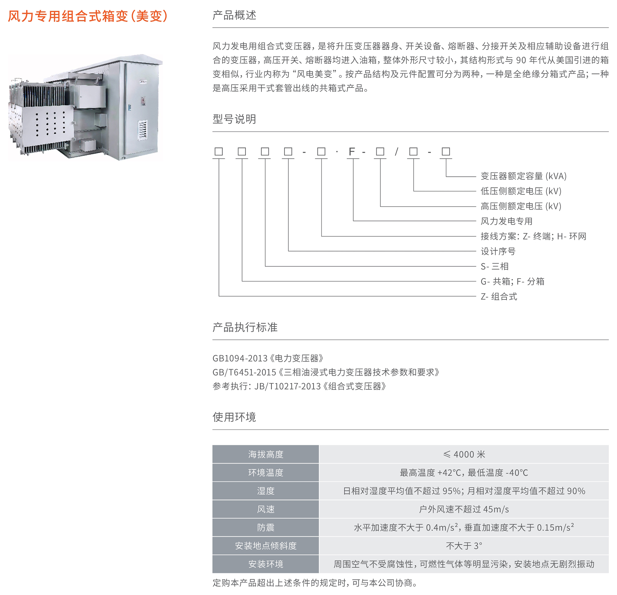 风力发电用组合式变压器,是将升压变压器器身、开关设备、熔断器、分接开关及相应辅助设备进行组合的变压器,高压开关、熔断器均进入油箱,整体外形尺寸较小,其结构形式与90年代从美国引进的箱变相似,行业内称为“风电美变”。按产品结构及元件配置可分为两种,一种是全绝缘分箱式产品;一种是高压采用干式套管出线的共箱式产品。