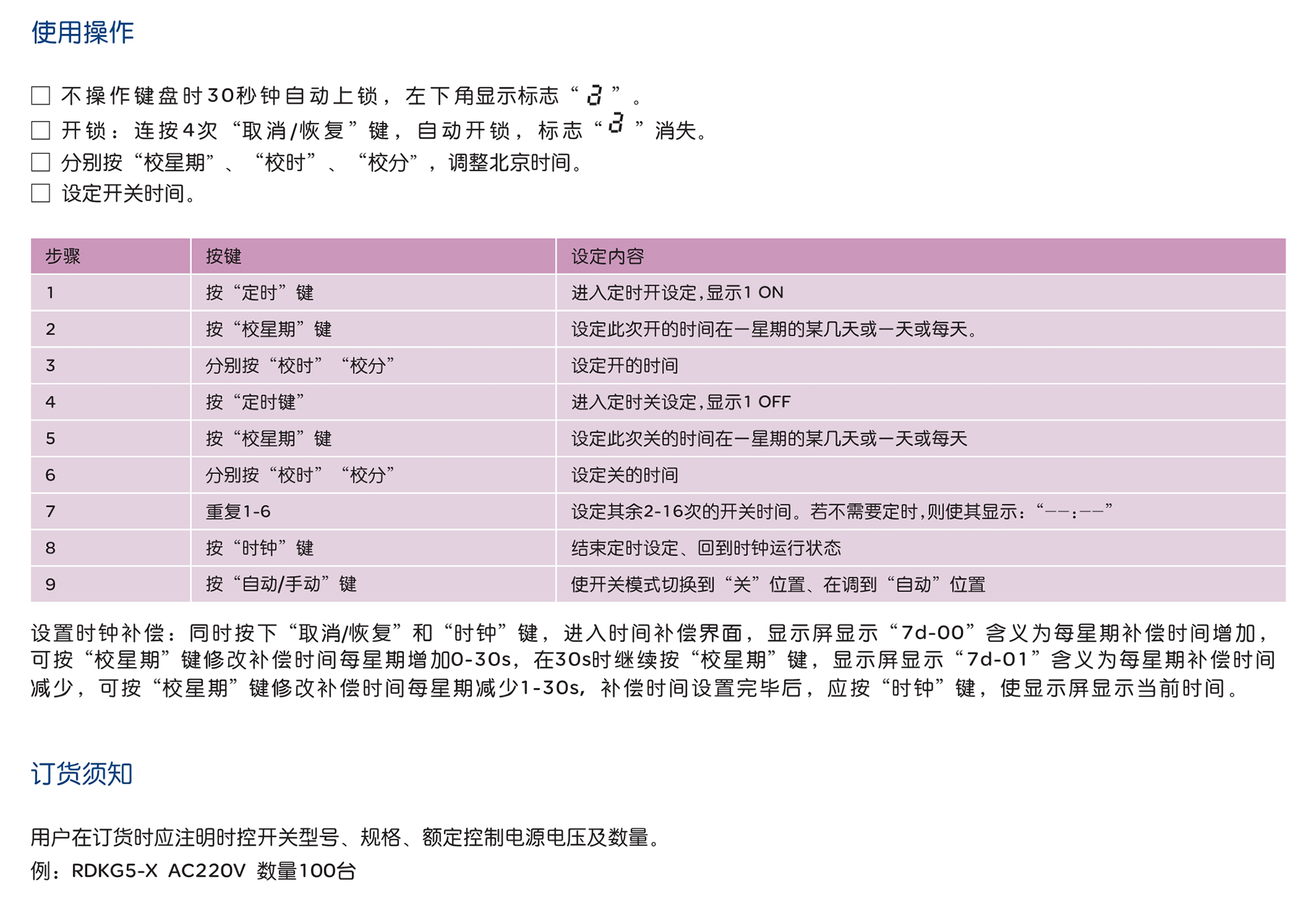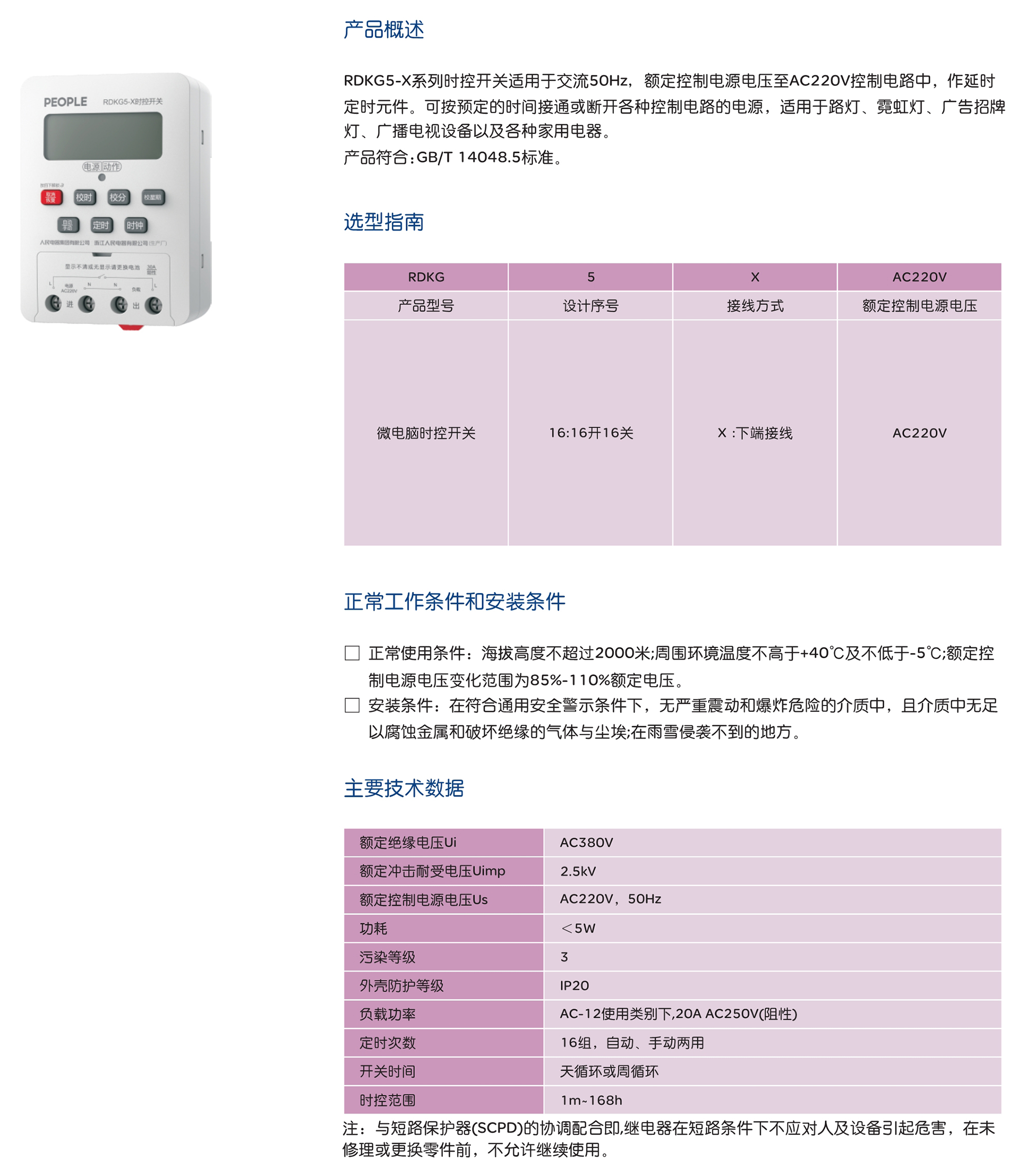 RDKG5-X系列时控开关适用于交流50Hz,额定控制电源电压至AC220V控制电路中,作延时定时元件??砂丛ざǖ氖奔浣油ɑ蚨峡髦挚刂频缏返牡缭?,适用于路灯、霓虹灯、广告招牌灯、广播电视设备以及各种家用电器。
