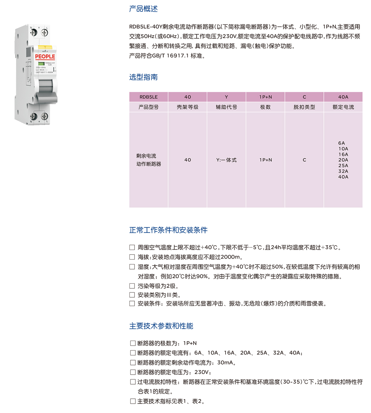 RDB5LE-40Y剩余电流动作断路器以下简称漏电断路器为一体式、小型化、1P+N,主要适用交流50Hz或60Hz额定工作电压为230V,额定电流至40A的?;づ涞缦呗分凶魑呗凡黄捣苯油ā⒎侄虾妥恢? 具有过载和短路、漏电触电?;すδ?。 产品符合GB/T 16917.1标准。