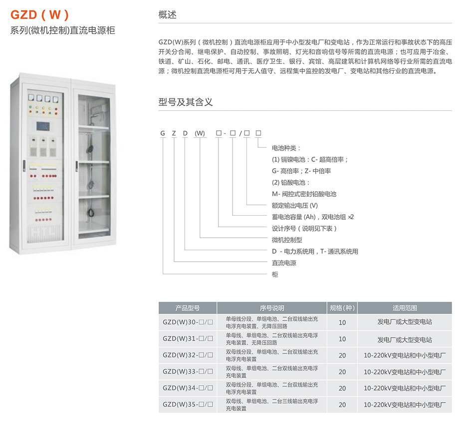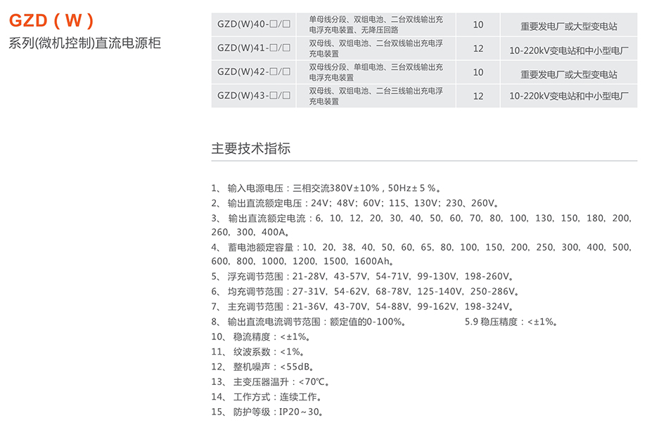 GZD(W)系列(微机控制)直流电源柜应用于中小型发电厂和变电站,作为正常运行和事故状态下的高压开关分合闸、继电?;?、自动控制、事故照明、灯光和音响信号等所需的直流电源;也可应用于冶金铁道、矿山、石化、邮电、通讯、医疗卫生、银行、宾馆、高层建筑和计算机网络等行业所需的直流电源;微机控制直流电源柜可用于无人值守、远程集中监控的发电厂、变电站和其他行业的直流电源。