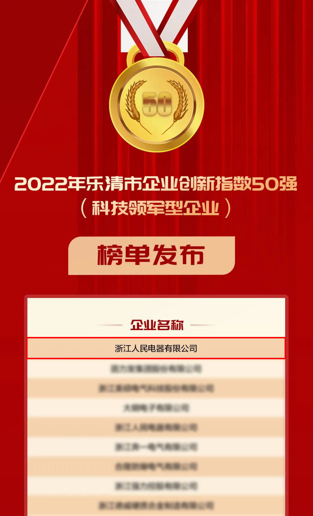 昨日,“乐清发布”公布2022年乐清市企业创新指数50强(科技领军型企业),人民电器集团下属分公司浙江人民电器公司光荣上榜!
