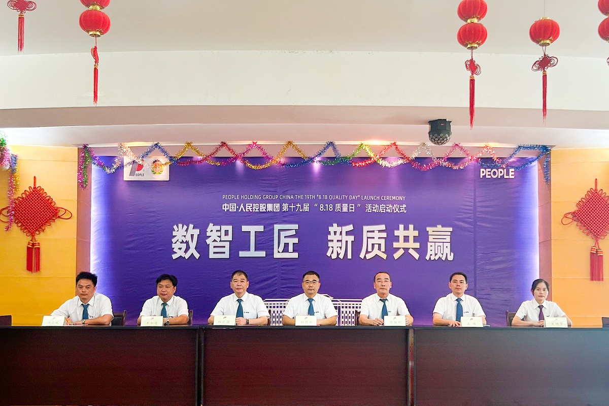 8月18日,江西变电设备公司内彩旗飘扬,人民控股集团第十九届"8·18质量日"活动启动仪式在此如期举行。本次活动以"数智工匠 新质赋能"为主题,旨在进一步强化全员质量意识,提升产品和服务质量,推动企业高质量发展。公司大会议厅内,主题巨幅横幅"数智工匠 新质赋能"格外醒目。